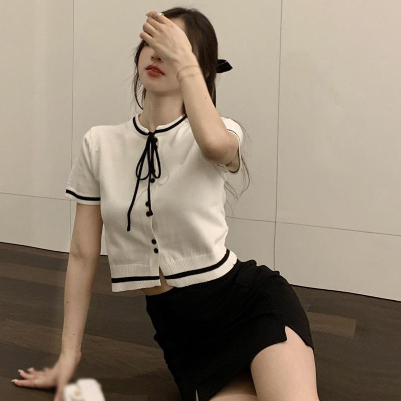 Женские вязаные топы с короткими рукавами, милая рубашка с галстуком-бабочкой, повседневная женская футболка