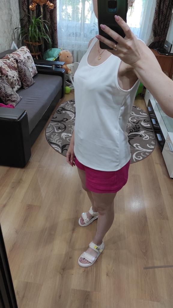 Летняя майка. Ткань эластичная, прохладная к телу, но приятная синтетика. Себе взяла на размер больше, хотела посвободнее, а в итоге получилась большая. Берите размер в размер. В целом неплохо.