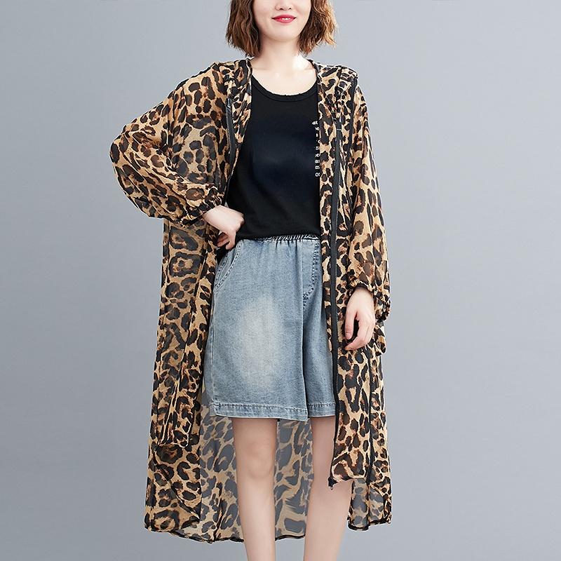 Dimanaf Большие размеры 2023, новая женская шифоновая блузка с леопардовым принтом, тонкие летние леопардовые пальто на молнии, длинная верхняя одежда оверсайз