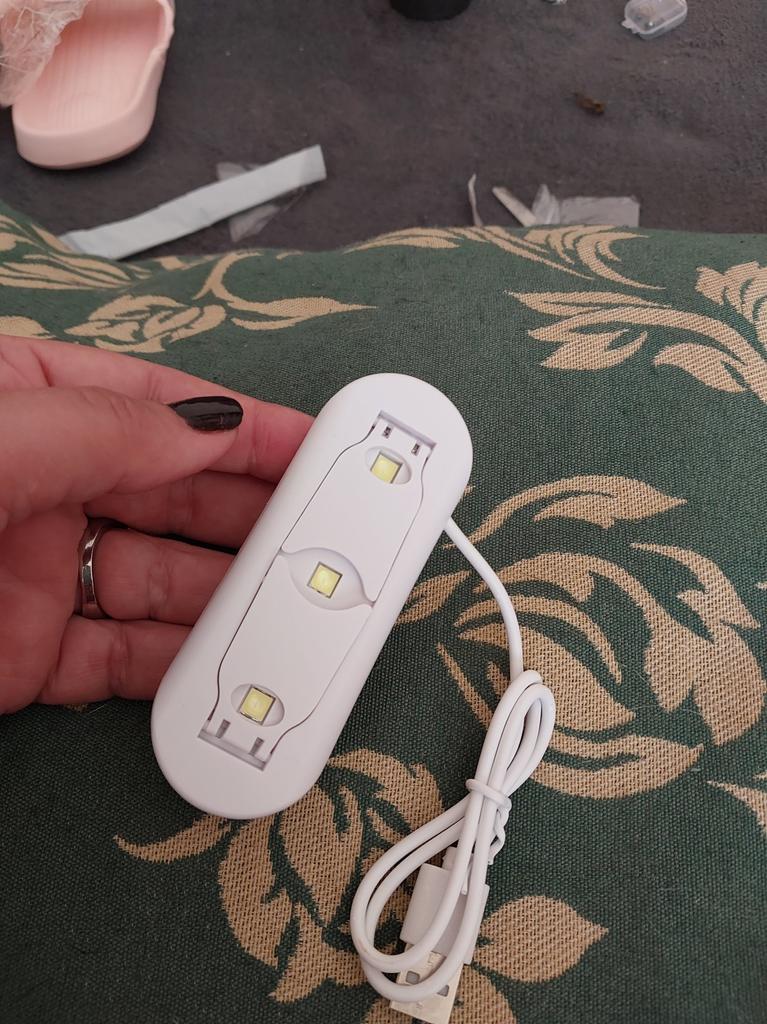 Получила лампу.С начала не поняла ,что это такое подумала,что перепутали заказ.Такое малюсенькое не понятно что.А потом разобралась,покрасила ноготь гель лаком,запустила под так называемую лампу и была приятно удивлена.Гель за пять минут высох.Мне понравилось.Теперь буду заказывать больше цветов таких гелей.Потом добавлю фотографии.