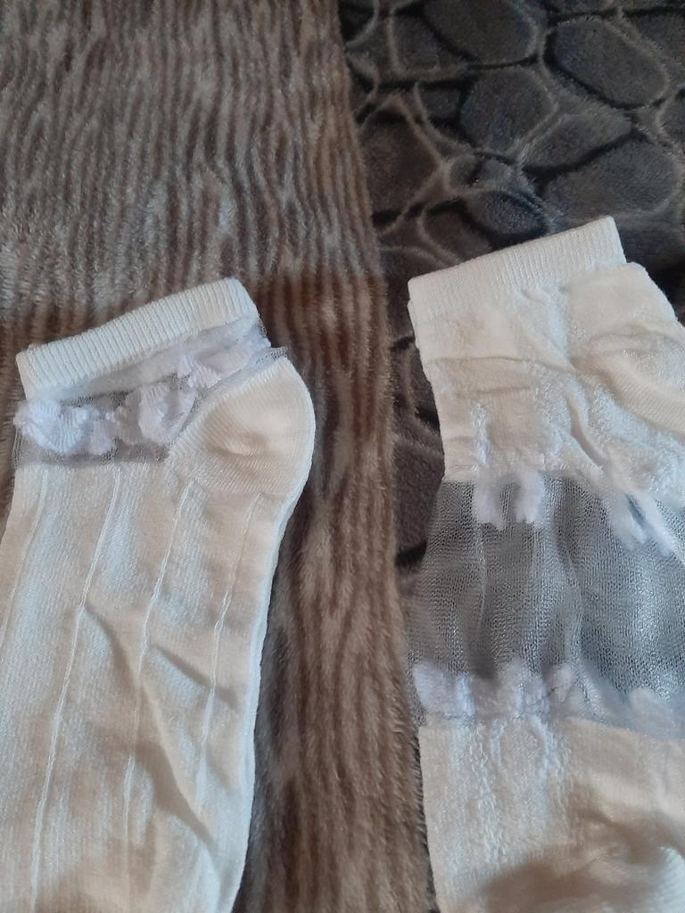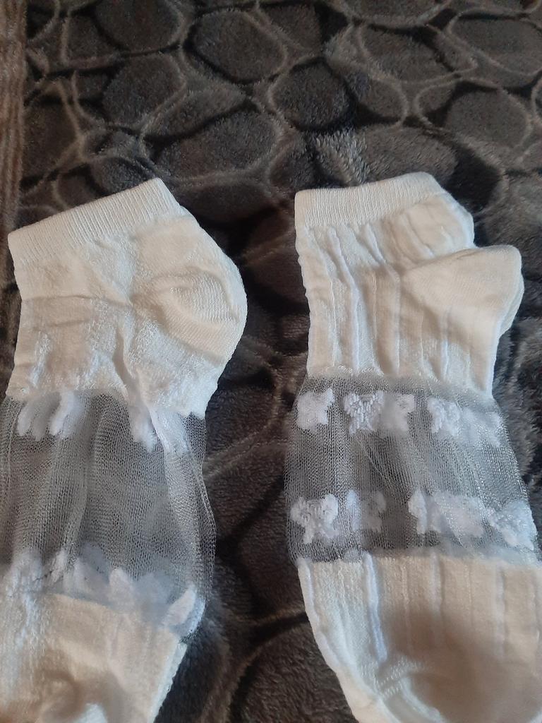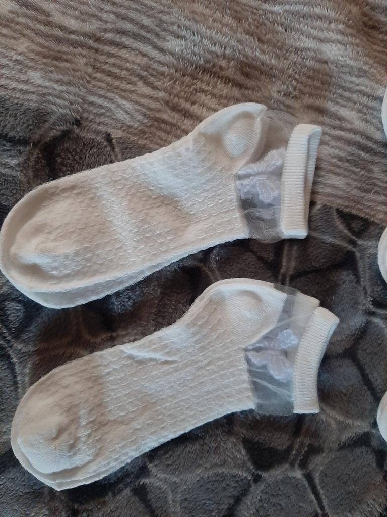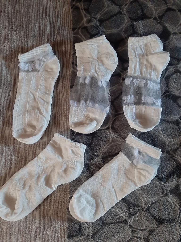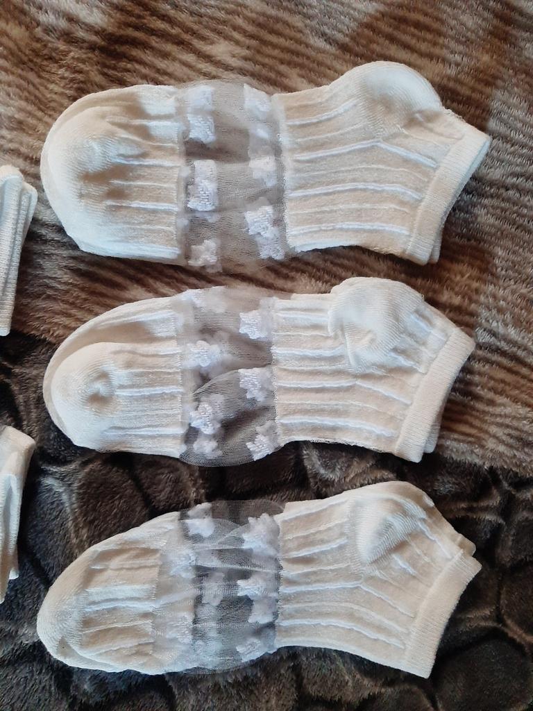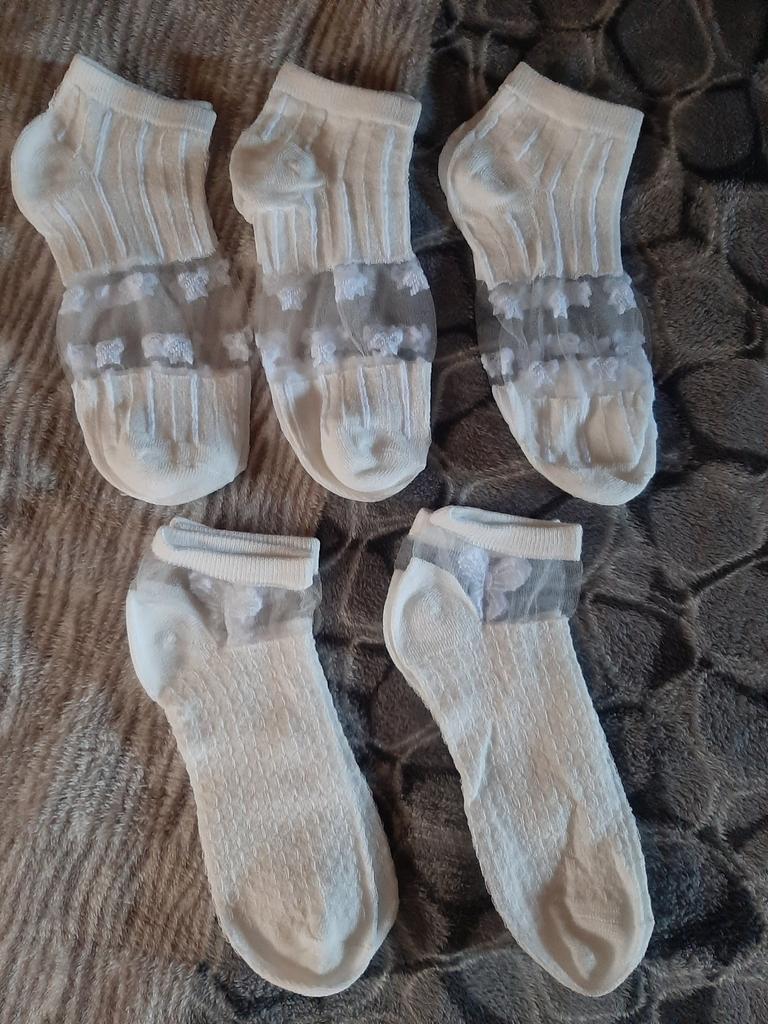 5 пар белых носочков , с разным рисунком и с разной структурой носочков. Цвет, скорее, молочный, а вот вставочки с рисунком- белоснежные. По размеру подошли хорошо , единственно, что смущает-сетчатые вставочки очень тоненькие, как паутинка, боюсь что порвуся очень быстро... Но , да ладно, сколько отслужат, ничего вечного не бывает...