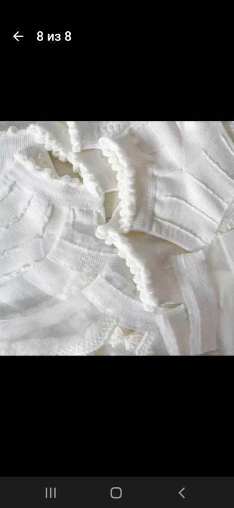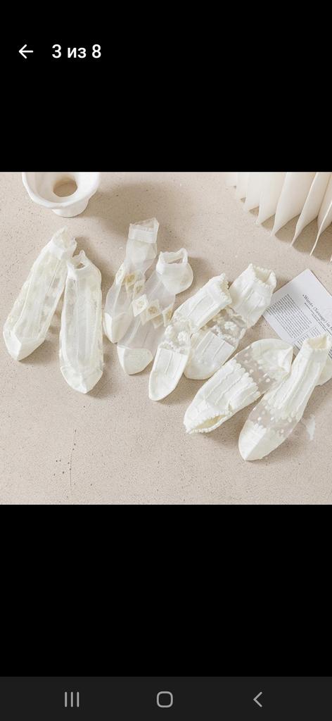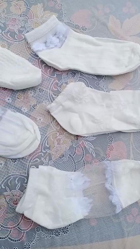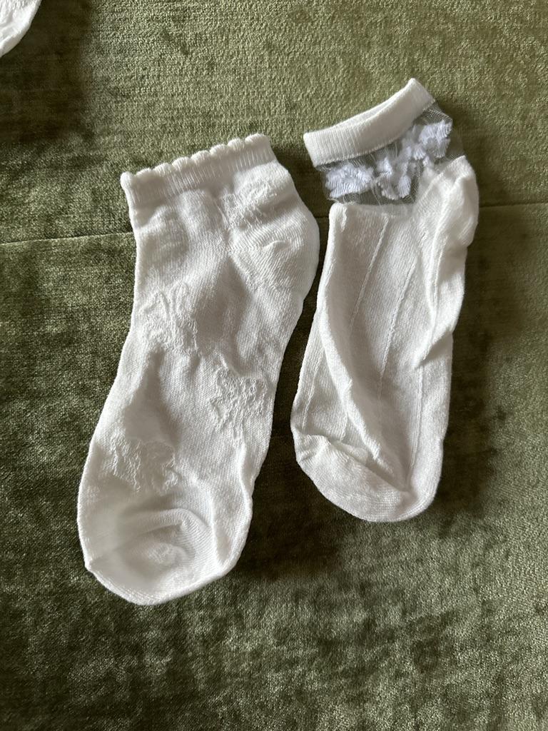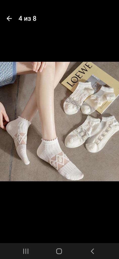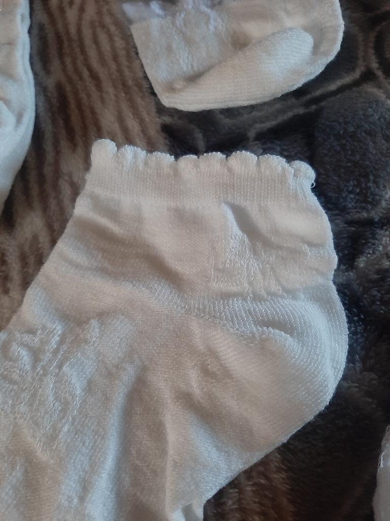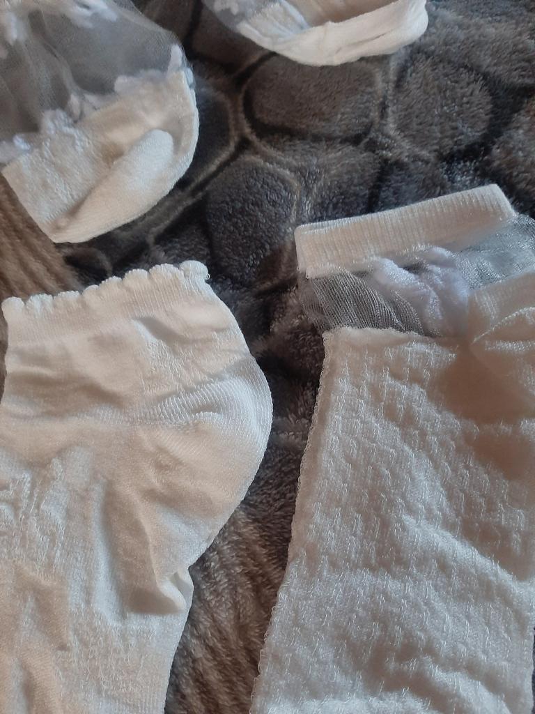 5 пар белых носочков , с разным рисунком и с разной структурой носочков. Цвет, скорее, молочный, а вот вставочки с рисунком- белоснежные. По размеру подошли хорошо , единственно, что смущает-сетчатые вставочки очень тоненькие, как паутинка, боюсь что порвуся очень быстро... Но , да ладно, сколько отслужат, ничего вечного не бывает...
