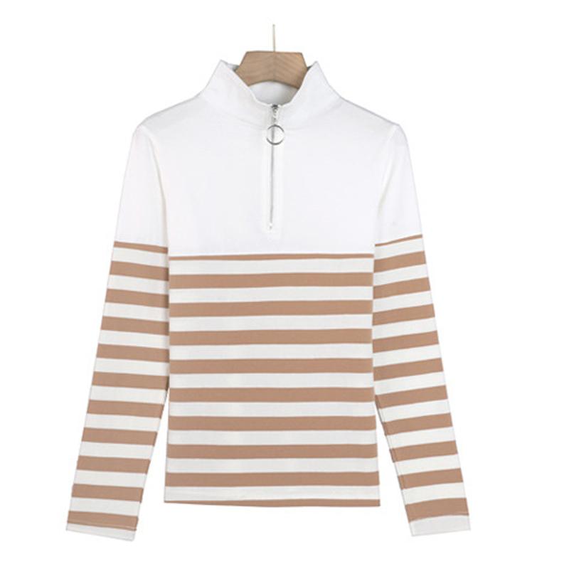 Пуловер в полоску, женская винтажная футболка на молнии, осенняя корейская мода, повседневные хлопковые женские топы с длинными рукавами, футболки