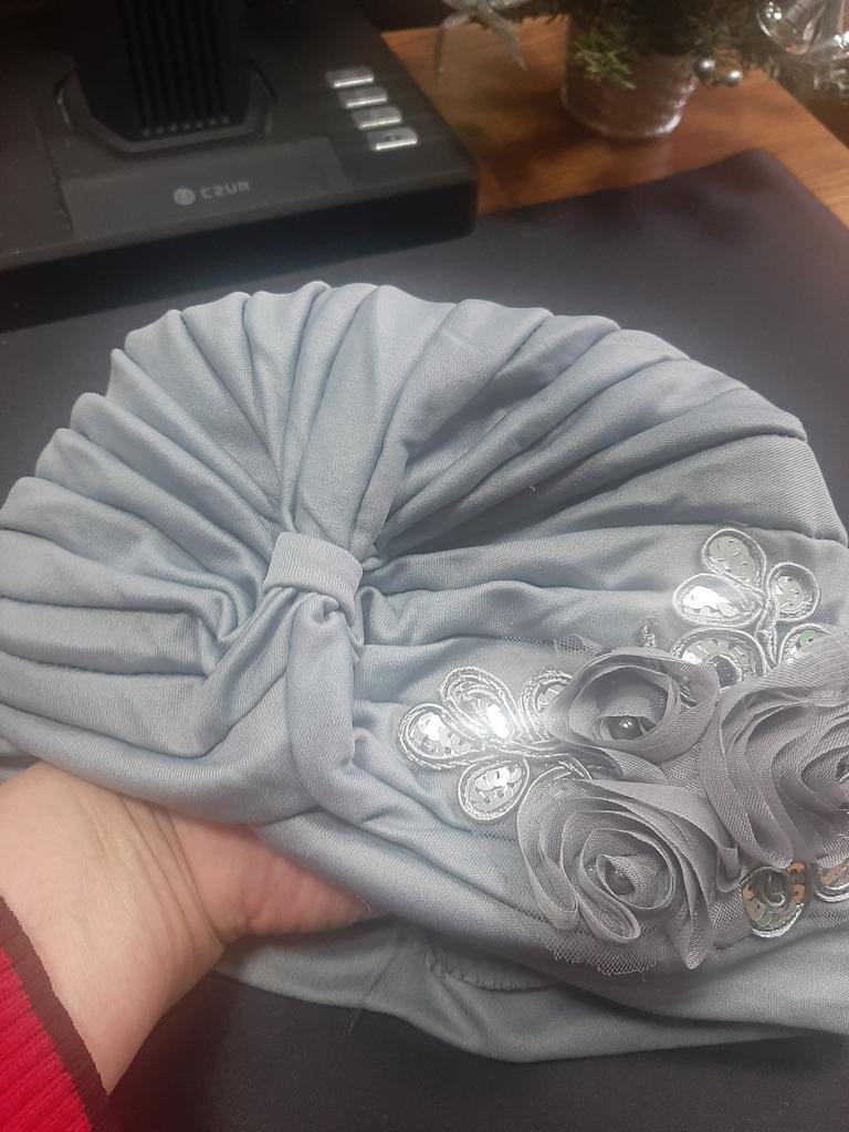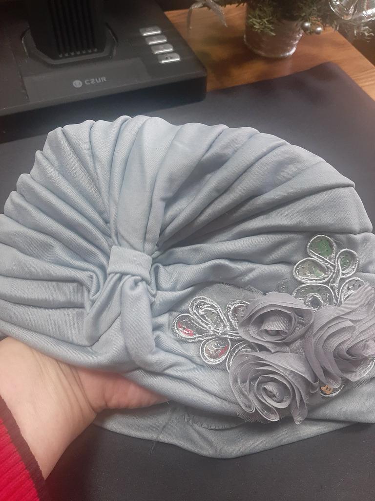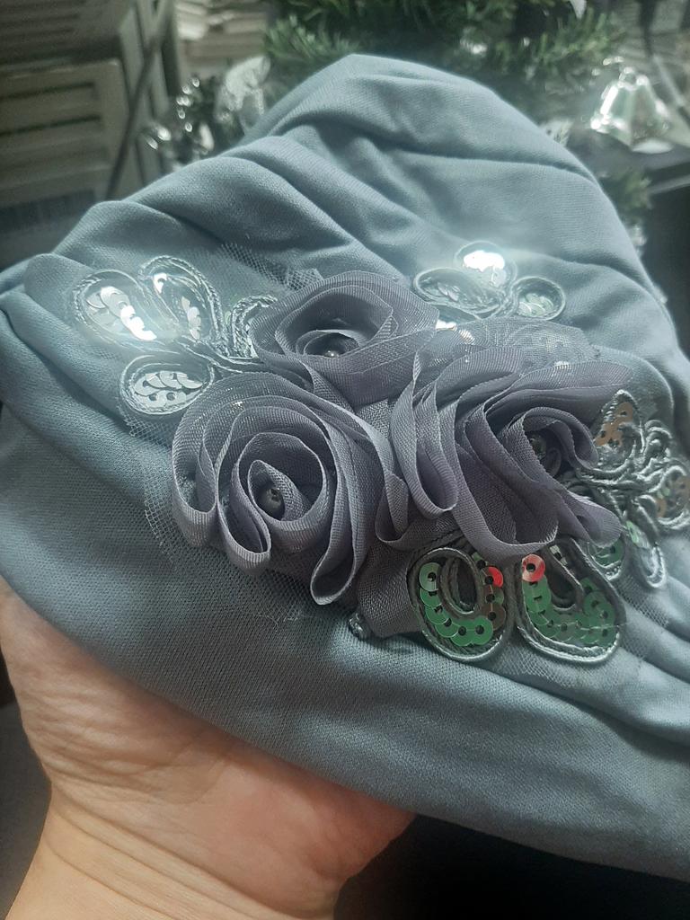 Прекрасная шапулечка в виде чалмы! Ткань лёгкая, подойдёт на тёплое время года - весну/лето! Подарила маме, она очень довольна!!! Заказала ещё в другом цвете! Розочки красивые, пайетки переливаются на свету, пошита хорошо. Спасибо!