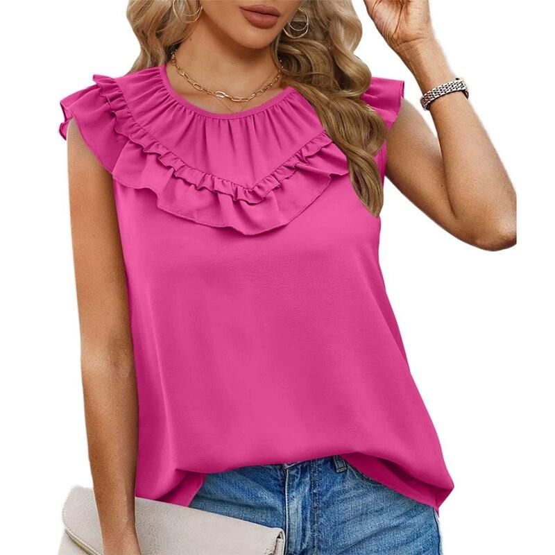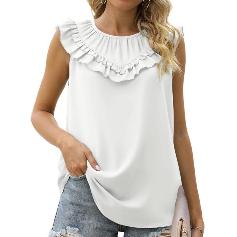 Летние свободные белые рубашки без рукавов с оборками, женские элегантные повседневные шифоновые блузки, женские однотонные топы с круглым вырезом, рубашка Blusas 25556
