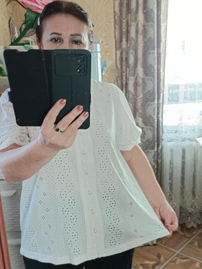 Замечательная блузка, вот только большемерит на два размера. Первый раз заказала XL, была очень велика, подарила её. Перезаказала на M, как с меня мерки снимали, супер! К покупке рекомендую! Дополнительный отзыв по просьбе Джум. Блузка красивая, ткань мягкая, приятная к телу, больше х/б, немного тянется. Один есть минус, передняя планка грубовата, но не критично. Пока не стирала, не знаю, как будет выглядеть после стирки, потом отпишусь.