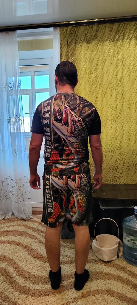 Костюм хороший, материал приятный очень, гладкий. Немножко майка мне маловата, ношу XL, такой и заказал. Рост 173,вес 84. 5 минут поеосил, немного растянулась, в целом хорошо. Немного накосячили с рисунком на шортах, двойная рыба получилась, но в целом очень понравился. На рыбалку само то.