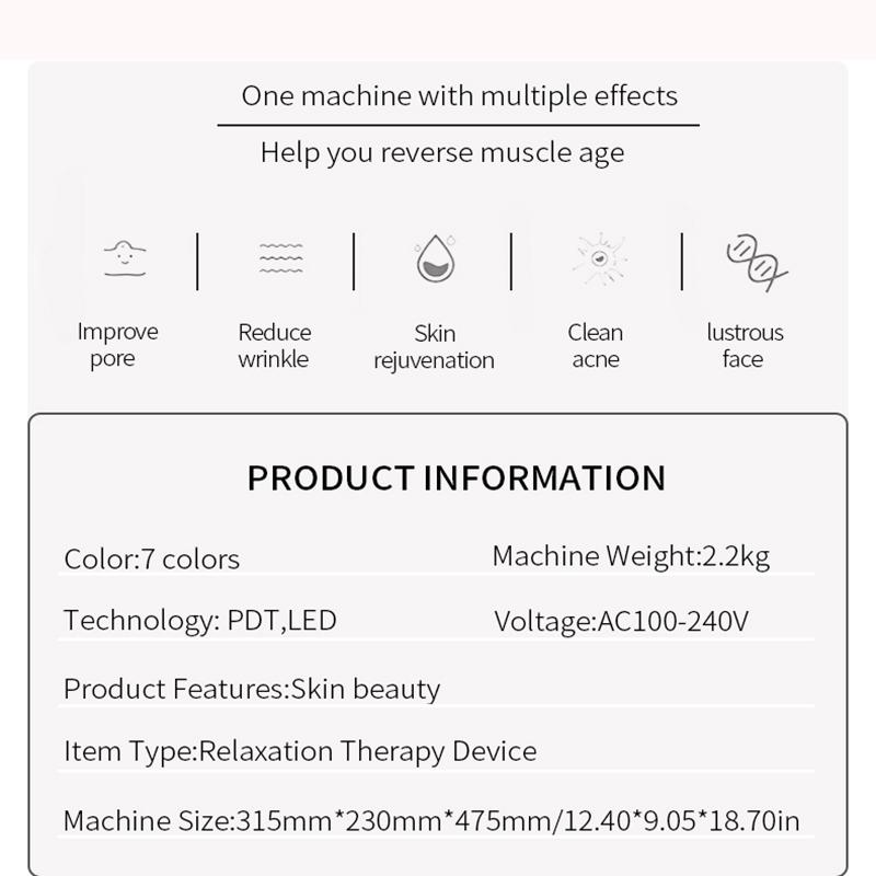 ● 7 нанотехнологий: лампы фототерапии в сочетании с 7 цветами светодиодных ламп с различной длиной волны используются для лечения проблем с кожей и помогают восстановить молодой внешний вид.