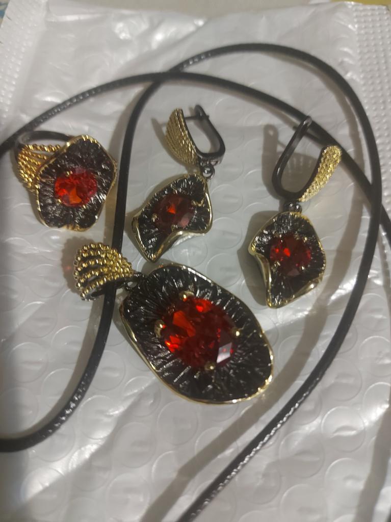 Приветствую всех! Собираю такой красивый набор... Сейчас в пути мои серёжки 😘 При покупке ориентировалась по отзывам, за это очень благодарна! 🤗 По фото и видео видно, что кулон крупнее и это меня очень обрадовала. Шнурок заменю на цепочку чёрного цвета, будет супер 👍 Размер кольца соответствует описанию. Камень не пластик, а стекло. Цвет камня похоже на грант. При свете ярко горят, прям огненные🔥 Я в восторге от них😍❤️💯 Рекомендую, не пожалеете! Отдельное спасибо за то, что весь заказ положили в одну посылку 🇰🇿