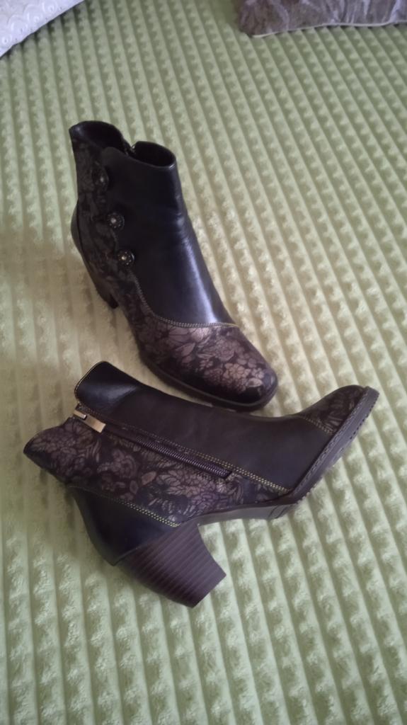 Сапожки пришли хорошо упакованные, ни сколько не пострадали. Кожа мягкая. Полусапожки очень лёгкие, удобная колодка. Размер большеват, но я это знала заранее, у меня размер 35, а самый маленький был только 36. Уж очень мне они понравились! Да и в магазине мне редко сапоги удаётся купить 35 размера. Спасибо за быструю доставку и отличное качество!