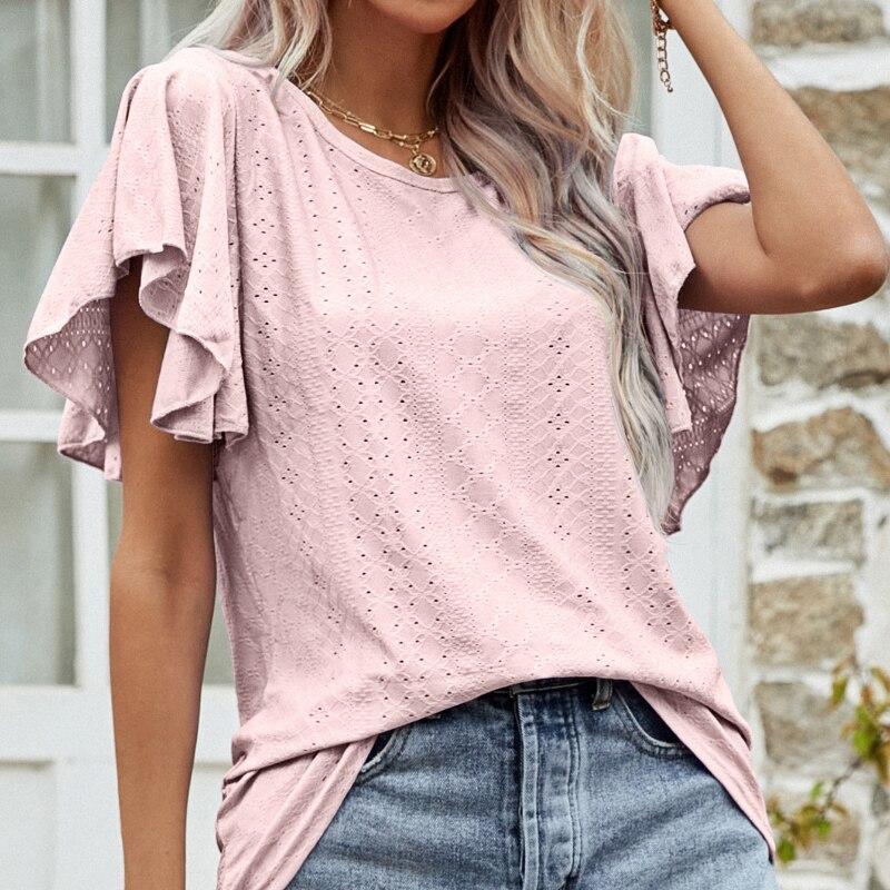 Свободная женская футболка с рукавом-бабочкой 2023 года, летние однотонные повседневные футболки с оборками, женская мода, футболки с круглым вырезом, топы 25978