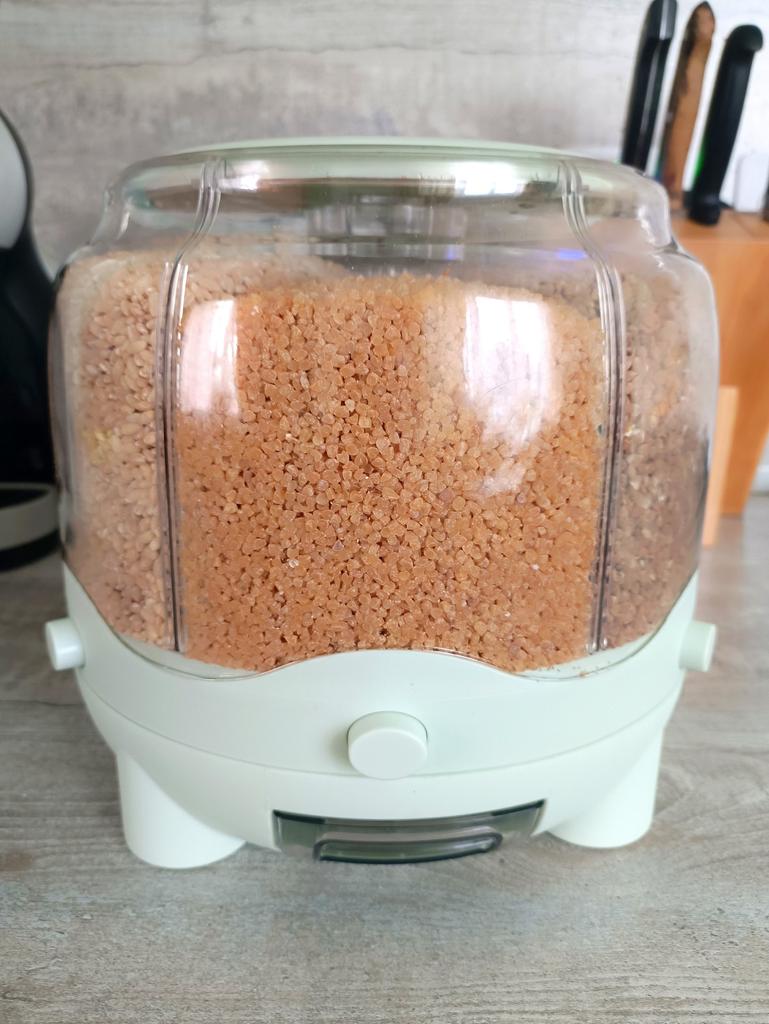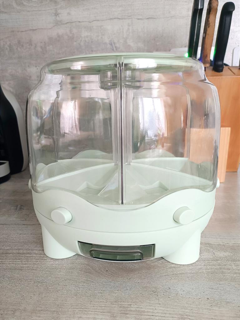 ❤️ ШИКАРНЫЙ ДИСПЕНСЕР ДЛЯ ГЕРМЕТИЧНОГО ХРАНЕНИЯ СЫПУЧИХ ПРОДУКТОВ 💯👍 🙋♂️ Всем привет! Сколько всё-таки полезных и нужных товаров придумали китайцы! Я постоянно нахожу на Джум что-то новенькое. То, что улучшает качество жизни, делает её более комфортной, добавляет эстетики и удобства. Заказал для маминой кухни вот такой классный вращающийся диспенсер с дозатором. Доставили быстро - всего за 24 дня, трек полностью отслеживался. Диспенсер пришёл в картонной коробке, слегка помятой. 🕵️♂️ К счастью, содержимое коробки не пострадало. Диспенсер просто великолепен! Итак, что это такое, и для чего я это купил? Диспенсер - это прозрачная ёмкость, разделенная на шесть секций, вращающаяся на подставке. В основании находится прозрачный контейнер, который наполняется при нажатии кнопки, когда нужная секция находится над мерным контейнером. Мой диспенсер рассчитан на 8 литров ( 6 кг), я специально брал именно такой объём. 💁♂️ Вообще в продаже есть и меньше (на 4,2 кг). Но именно в таком диспенсере секция вмещает 900 гр - 1 кг крупы, а это стандартная упаковка. Почитав отзывы о маленьких ёмкостях, я понял, что не хочу, чтобы у мамы оставались остатки круп по тем же пакетикам, от которых мы так хотим избавиться благодаря данному девайсу. И нам это удалось - на фото и видео это прекрасно видно. 😉 Насколько я понял, производитель данного устройства не очень важен. Все круглые диспенсеры устроены по одному принципу, продаются разными продавцами на маркетплейсах, мне важнее было узнать, от кого из продавцов товар доходит целее. Что ещё порадовало - никакого неприятного запаха пластика от покупки не было. Диспенсер вращается в обе стороны на все 360 градусов. ☺️ Установив нужную секцию с крупой над контейнером, нажимаем кнопку и вуаля - насыпаем нужное количество крупы (или не крупы). Некоторые хранят даже кофейные зерна, я видел на фото. Даже если переборщили, лишнее легко насыпать обратно. Контейнер не большой и не маленький, на глаз на 250-300 грамм. Сверху пластиковая крышка, закрывает секции достаточно плотно. ☝️ В середине ёмкости есть место для специй (для отпугивания всяких жучков), я положил туда подарок - пакетик с травками от вредителей. За подарок отдельное спасибо, кстати. В дальнейшем (после того, как содержимое пакетика перестанет действовать) намереваюсь наполнить её зубчиками чеснока, можно положить и лавровый лист, имбирь, гвоздику. Наполненный крупами диспенсер выглядит красиво. ‼️ Габариты надо обязательно учитывать при заказе такого девайса, хотя многие ставят его и просто на столешницу, что тоже может быть удобно. Я именно так и сделал. Кстати, на дне у него четыре круглых ниши для специальных резиновых кружочков, которые были в комплекте - за счёт этого диспенсер не скользит на полке при вращении секций. Продавец не советует хранить мелкие фракции, такие как сахарный песок, например. 💁♂️ В отзывах не советуют хранить овсяные хлопья, они плохо сыпятся. Рекомендую данный диспенсер всем желающим!