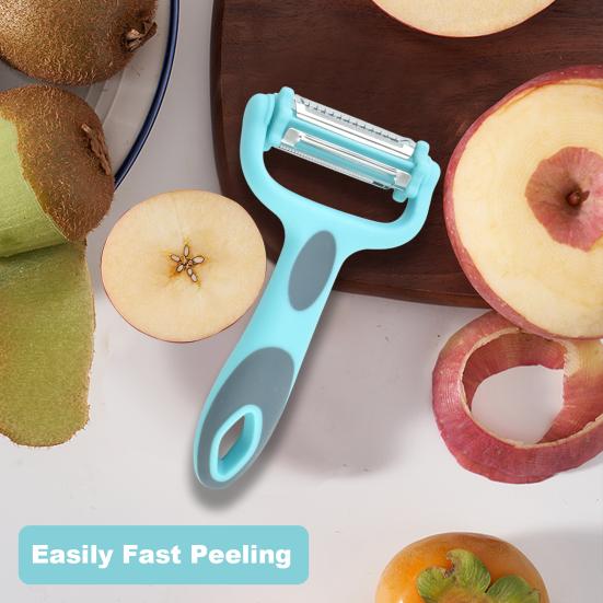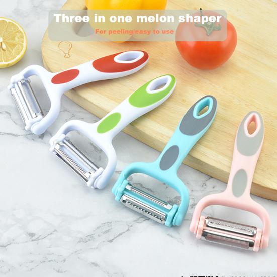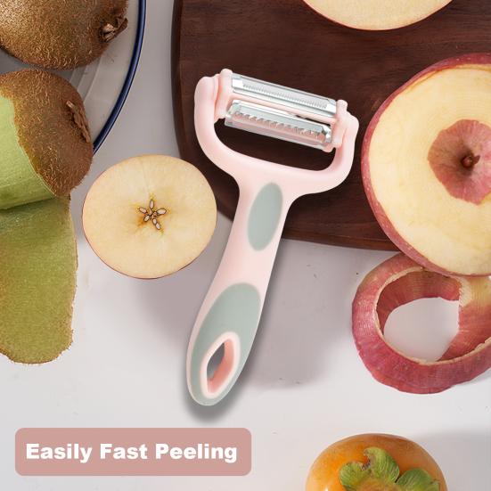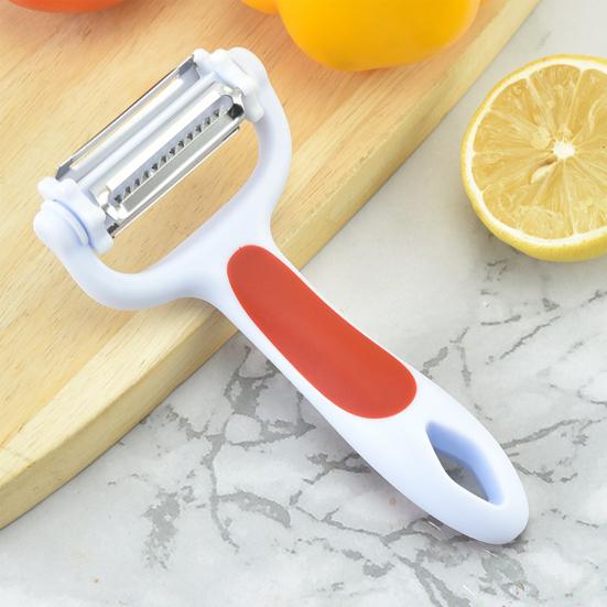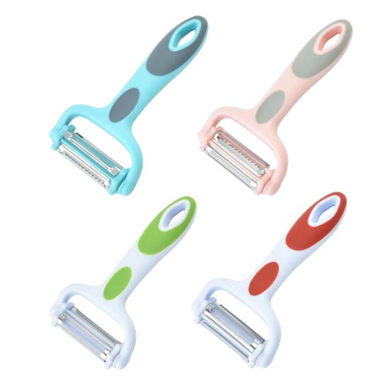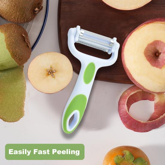 Они твердые и острые для быстрой обработки овощей и фруктов с твердой или мягкой кожурой, которые состоят из лезвия из цинкового сплава, головки из нержавеющей стали, овощечистки, терки и слайсера конструкции 3-в-1.