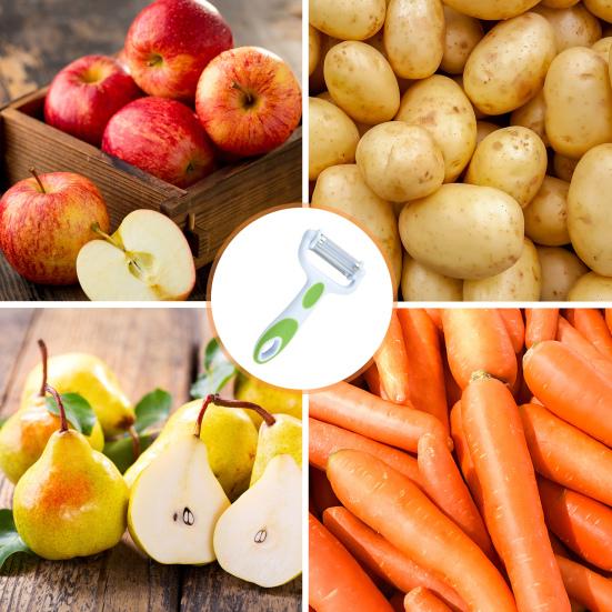 Универсальный очиститель идеального размера, с легкой в захвате и нескользящей эргономичной ручкой, легко очищает овощи и фрукты, такие как морковь, картофель, яблоки, персики, тыквы, огурцы и многое другое.