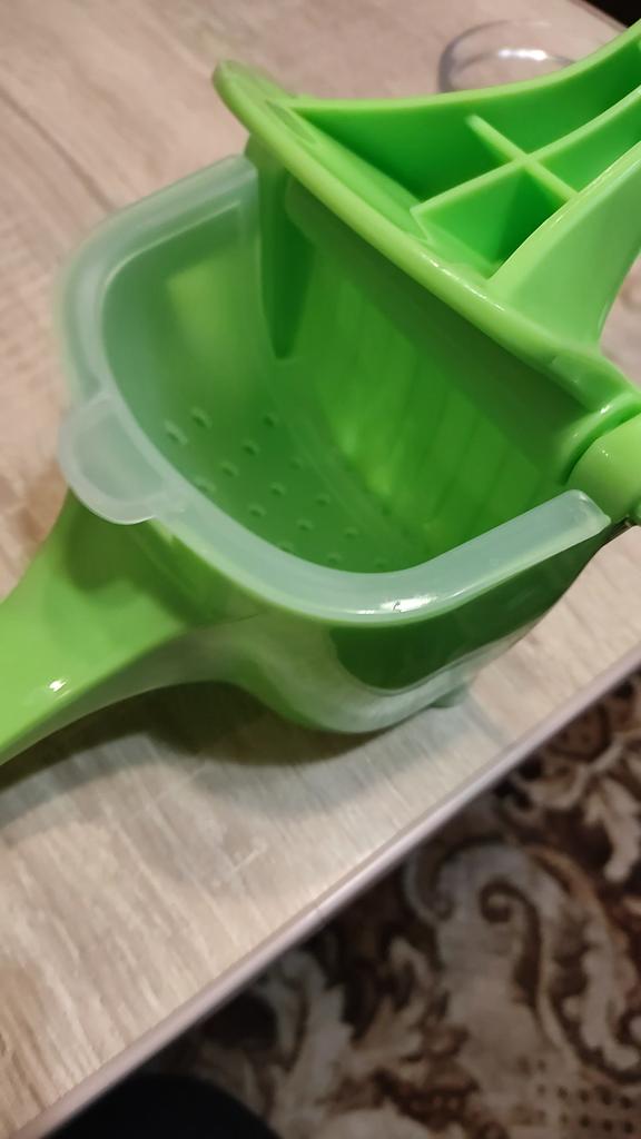 Ну что, получила я свой заказ — цитрус-пресс. Доехал ко мне девайс целым и невредимым, уже за это спасибо. Успела опробовать. Выжимала для курда лимоны. Вердикт таков: могло быть и лучше, хотелось бы, чтоб было лучше, но… Всё хлипкое, пресс работает не очень. Верхняя ручка, на которой, собственно, расположен пресс, мягкая и гнётся. Всё время боялась, что она сломается. Выжимать сок из апельсинов — вообще не вариант. Поэтому сейчас я всё ж выбрала бы металл и обычную круглую, а не пластмассу и такого типа. Пока, в общем, девайс работает, если, конечно, это можно назвать работой, и на сколько его хватит при регулярном использовании, я не знаю. Опять же цитрус-пресс лимоны мои выжать-то выжал, но не до конца, потому довыжимать сок цитрусов пришлось вручную. Кто рассматривает к приобретению, вам решать. Я не рекомендую.
