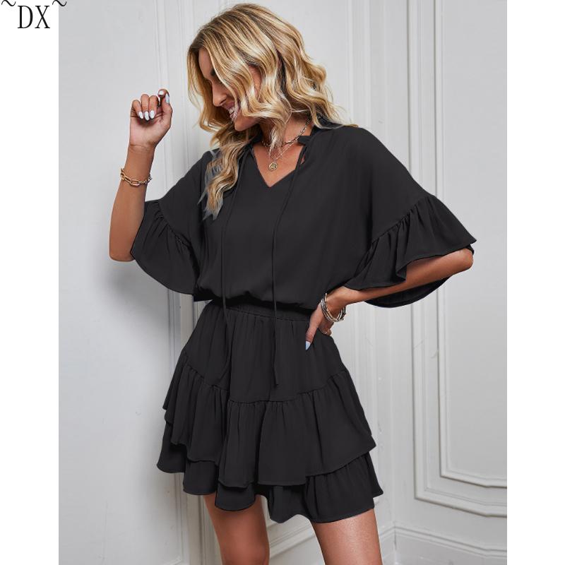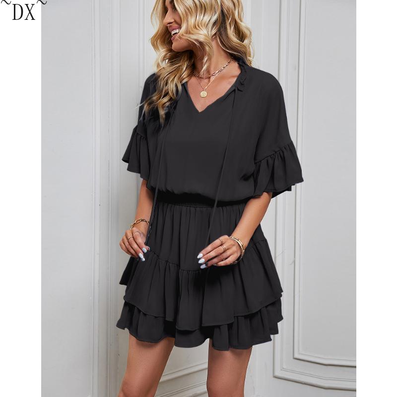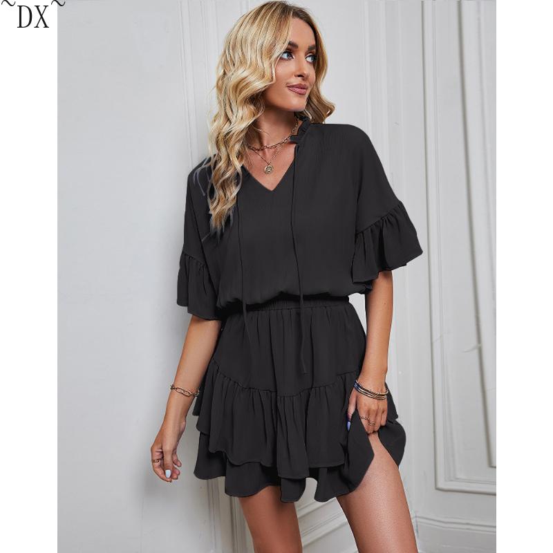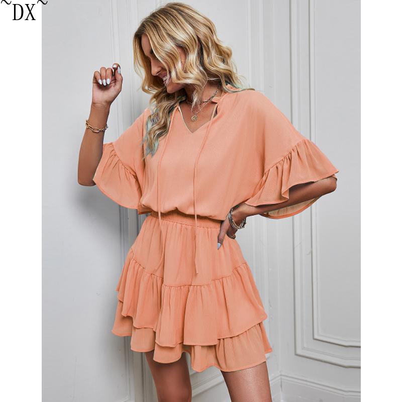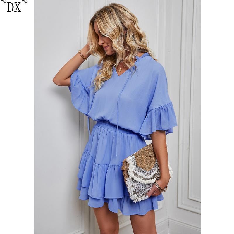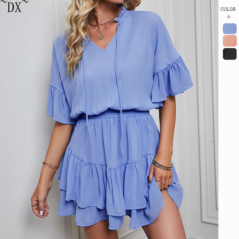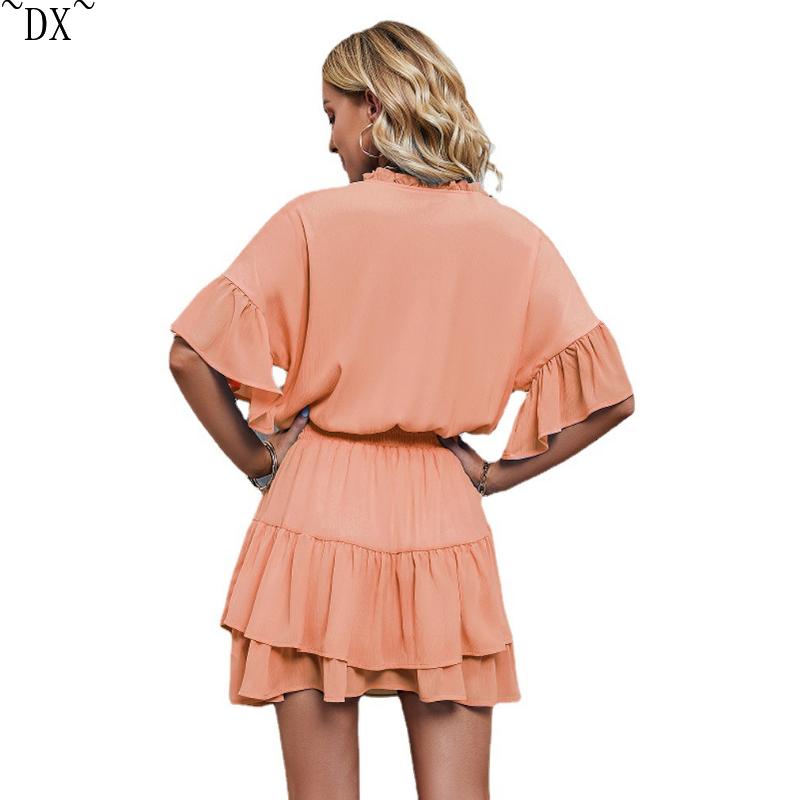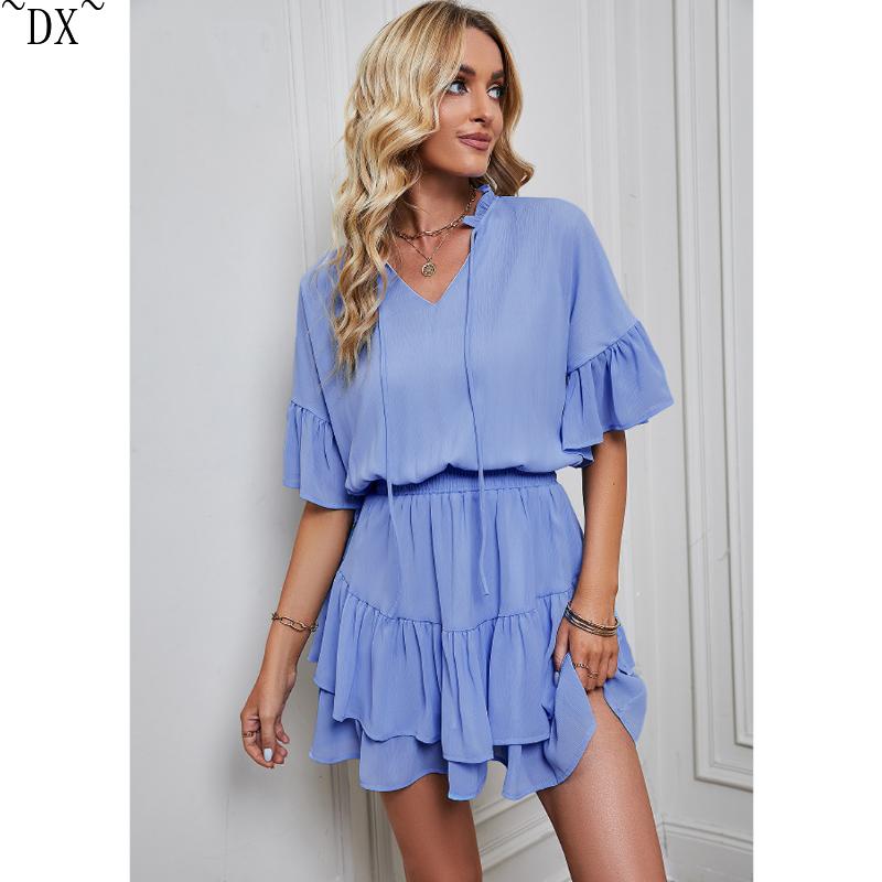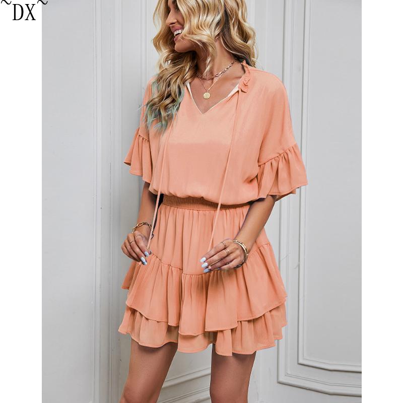 DX~~ Новое женское весенне-летнее однотонное платье с рюшами Amazon для внешней торговли