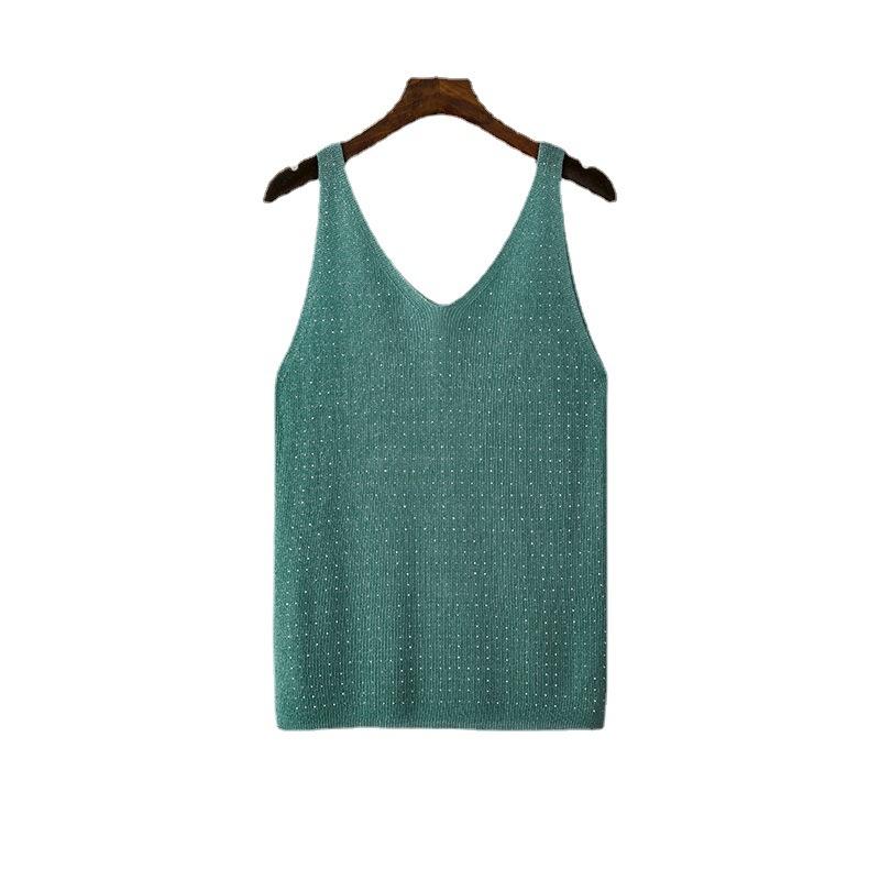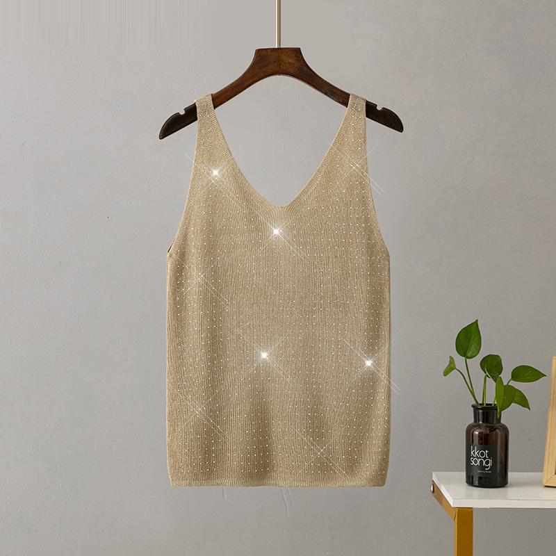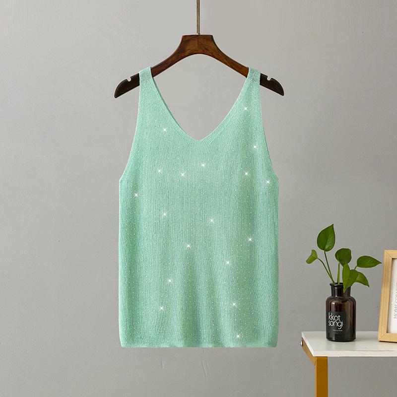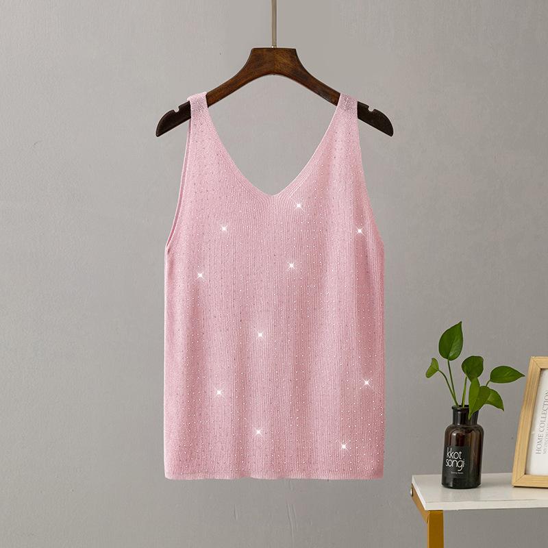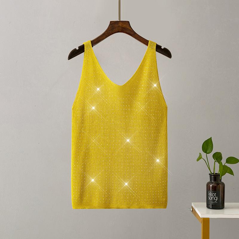 Женские летние вязаные подтяжки из ледяного шелка с яркой нитью и кристаллами с v-образным вырезом, сплошной цвет, облегающий сексуальный топ на бретелях