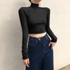 Женская футболка с высоким воротником, пуловер с длинными рукавами, однотонный укороченный топ