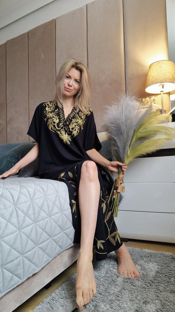 Очень простое, и безумно красивое летнее платье ☀️💃 Очень-очень-очень приятная к телу ткань - 100% вискоза. Платье объемное, в нем себя чувствуешь легко и комфортно. Ткань мнется меньше чем хлопок, при этом она не электролизуется, очень нежная. 🪶🪶🪶 Мне постоянно хочется кружиться 🖤 И конечно же просто потрясающая золотая вышивка 🔥 Вышивка просто идеальная! Я покупала это платье в качестве летнего пляжного варианта, но сейчас понимаю, что буду с удовольствием его носить и дома. Я не люблю халаты, а это платье - простотнаходка 🥰 Мои параметры: рост 171 см, 86-66-90. Платье прямого фасона, "летучая мышь", замеры: грудь = талия = бедра = 160 см длина по спинке = 130 см плечи переходящие рукава = 87 см.