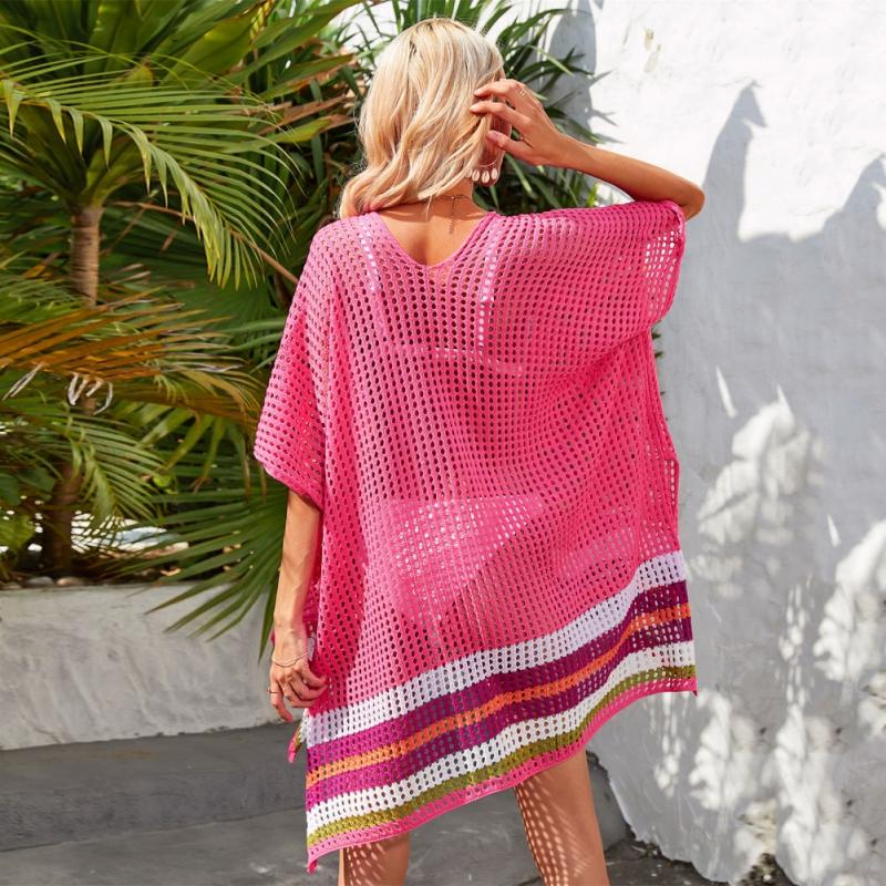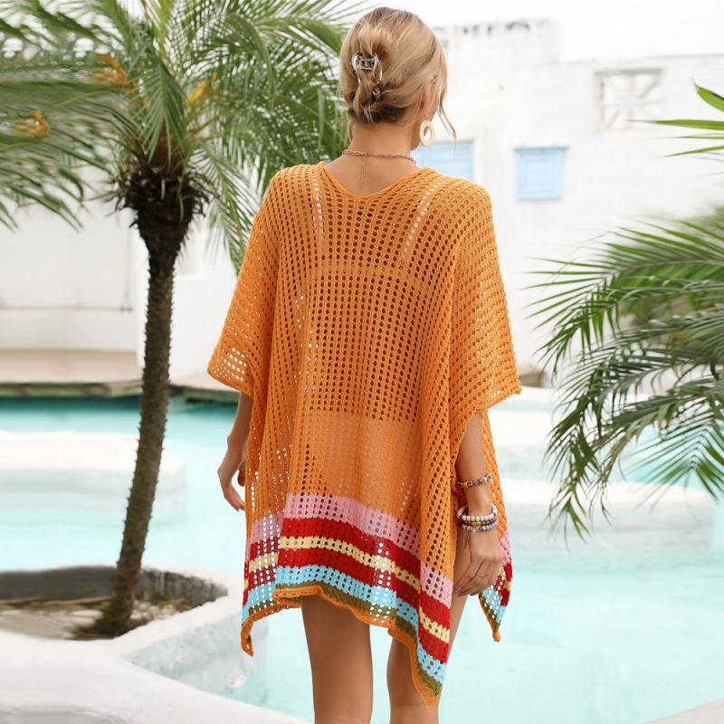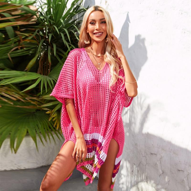 Женская свободная трикотажная пляжная блузка с v-образным вырезом и контрастным цветом, пляжная одежда средней длины, накидки на бикини