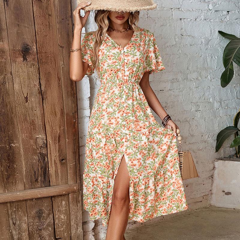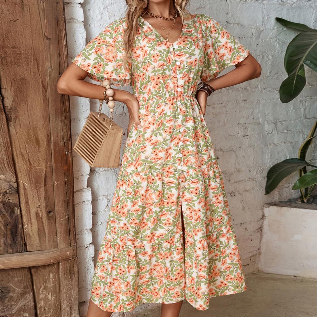 YYFS Женская мода лето весна цветочный принт с коротким рукавом V-образным вырезом с высокой талией повседневные платья