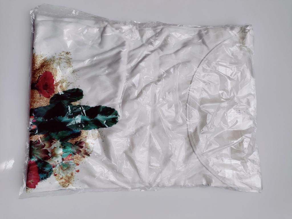Симпатичная футболка на каждый день. Мягкая, к телу приятная синтетика, не электризуется, не просвечивает. На свой 48-й, ОГ - 98 см взяла 3XL. Легла футболка свободно, я не люблю в облипочку. В целом я довольна. Кто нормально относится к синтетике, вполне носибельная вещь. Доставка почти месяц, в сборной посылке, что всегда удобно. Трек полностью отслеживался. Спасибо большое 🤗 продавцу за товар и Джуму за доставку.