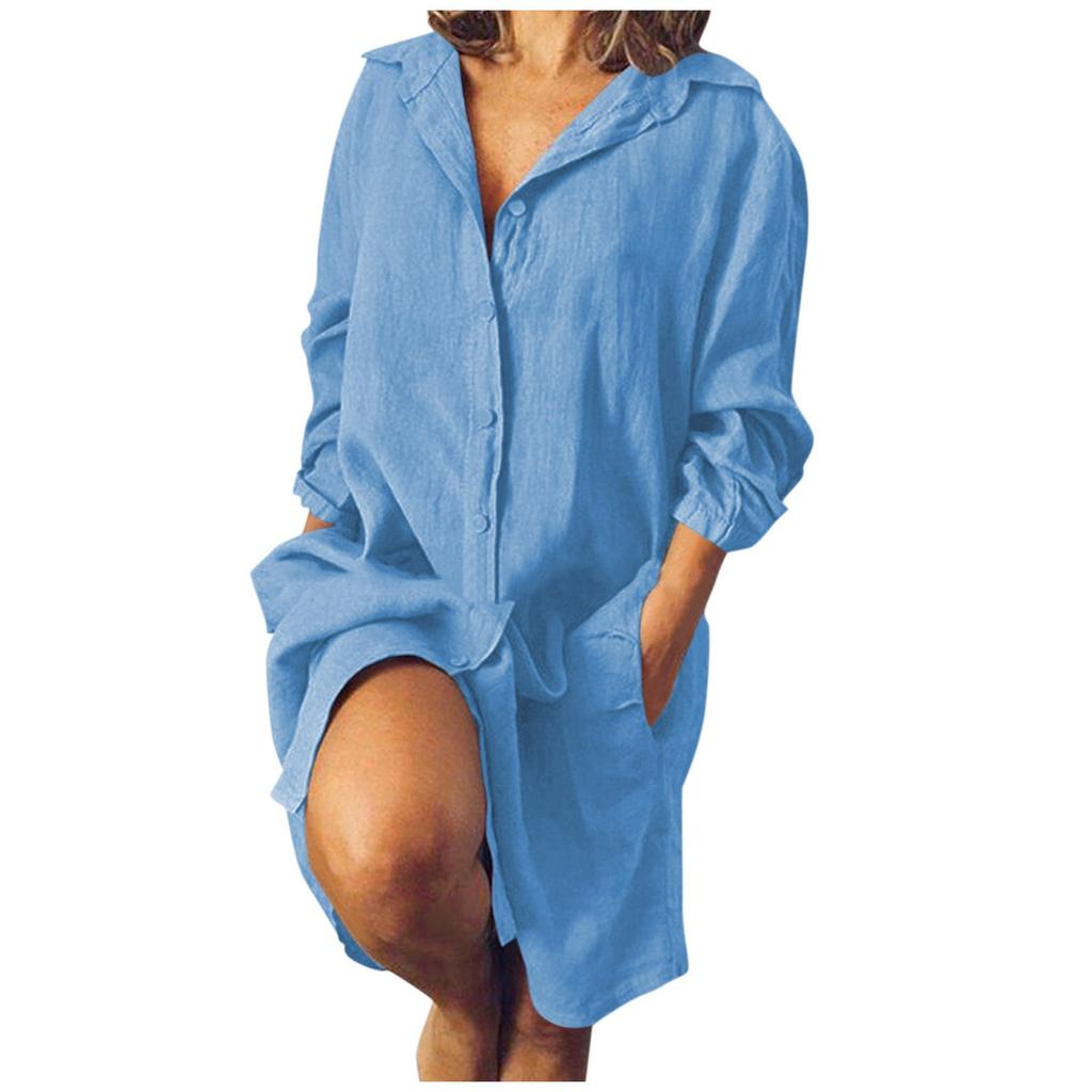 Женщины Хлопчатобумажная и льняная рубашка ПлатьеButton Down V-образный вырез Длинный рукав с карманом до колена ОСОБЕННОСТИ: