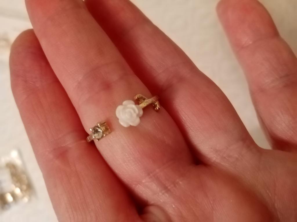 колечко пришло в сборной посылке, посылка шла долго. Колечко хотя и безразмерное, но очень маленькое, и розочки почти не видно совсем, само кольцо на детский палец, и цветка не видно. Совсем отличается от фото продавца. Очень разочарована.