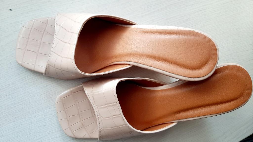 Шлепки на высокой горке из синтетической лаковой кожи. Кожей даже как- то неудобно называть, скорее из клеенки блестящей. На российский 40 взяла рекомендованный 42, но так как ступня у меня узкая, пяточка получилась свободной, можно было взять на размер меньше. Не знаю для чего купила, но пусть будут.