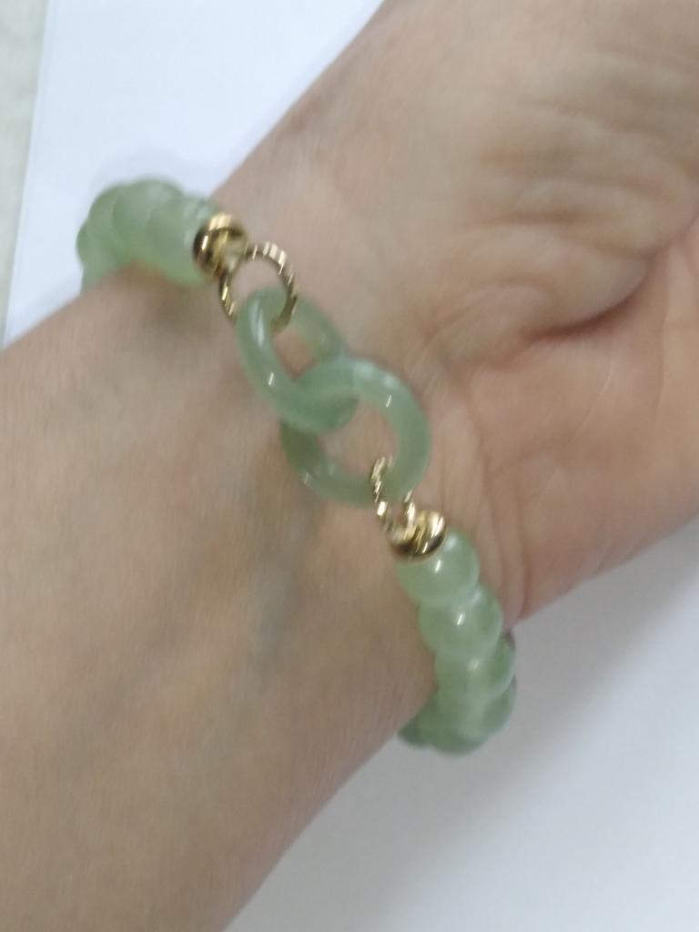 Сильно сомневаюсь, что это нефрит. больше похож на подкрашенное стекло. На одной из фотографий положила рядом бусину из этого браслета и один из своих кулонов с настоящим нефритом. Видно, что по структуре камни совершенно разные. Застёжка в форме сердечек вообще из пластмассы. К нефриту браслет не имеет никакого отношения. Это стекло с пластмассой. Но это не самое плохое. Браслет пришёл не собранный. Отдельно резиночка с пластмассовыми сердечками, отдельно бусины. Одно из сердечек сломано. Я не на такое рассчитывала, когда делала заказ.