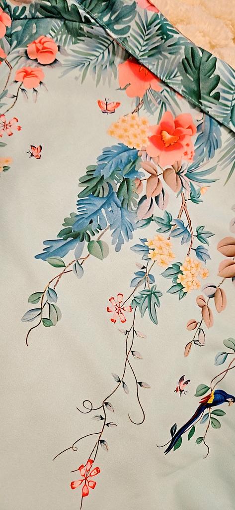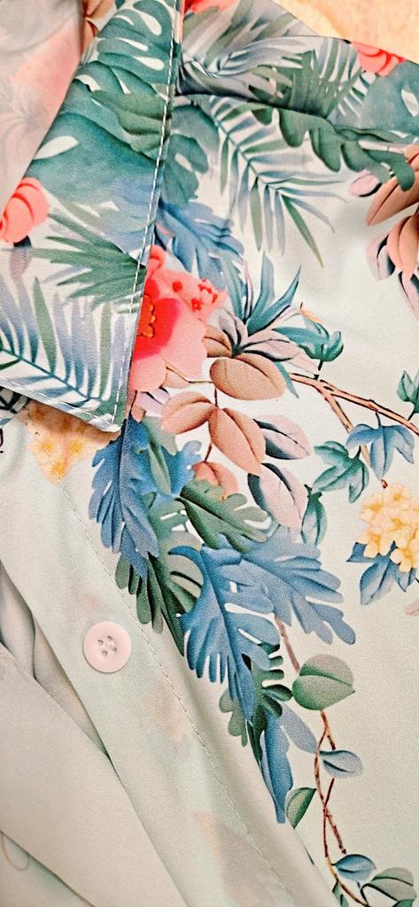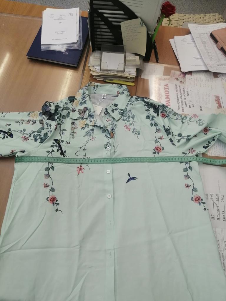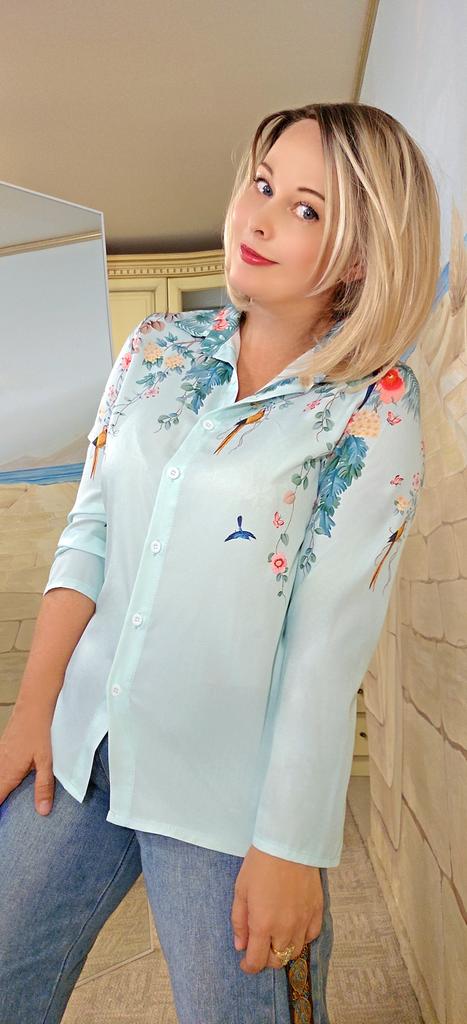 Нежная красивая блуза🌿 Цвет очень приятный, светлой морской волны, цвет свежести)) в верхней части красивый растительный рисунок с яркими цветами, это придаёт блузочке индивидуальности! Смотрится очень красиво. Блуза из шелковистой блузочной ткани, полиэстер, не шуршаший, нежный, приятный к телу. Рукав длинный, без манжет, немного сужается к краю. Аккуратный воротничок, застежка на пуговки. По размеру блуза немного маломерит, лучше брать на размер - два больше. По моим замерам размер М Ог 100см, Длина рукава 53,5см Длина плеч 38см, длина блузы 64см. На параметры 95-75-99 размер М тютелька в тютельку)) Красиво смотрится с джинсами, белыми брюками и юбками😻 Замечательное качество! От души рекомендую 🧡🧡🧡