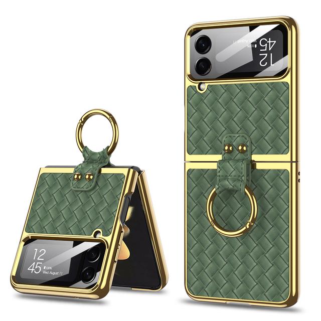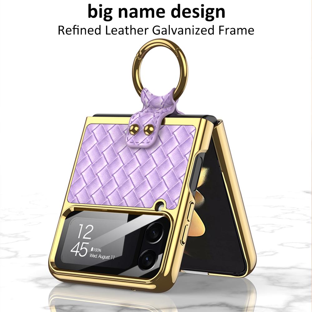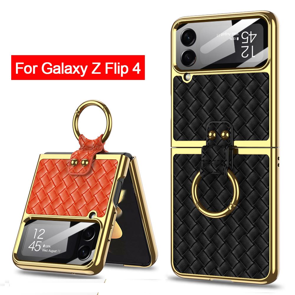 Капа-подставка с кольцом для Samsung Galaxy Z Flip 4 5g Flip4, чехол с плетением, текстурированная кожа, линзы, закаленное стекло, пластиковый чехол для ПК