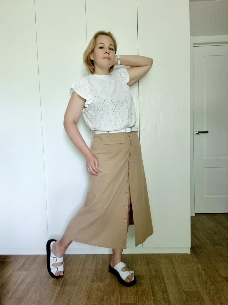 Ткань юбки для лета выбрана правильная, тонкая, без просвета. Пошито изделие хорошо, швы обработаны качественно. Немного велика юбка в талии, это особенности фигуры, покупала 2XL, цвет хаки. Вставлю широкую резинку по спинке и будет всё ОК. Считаю покупку нужной для себя и рекомендую покупателям. Когда стала перешивать пояс, чтобы вставить широкую резинку, усмотрела, что петли на левой полочке, а пуговицы на правой. А ведь юбка женская. Неужели так должно быть?