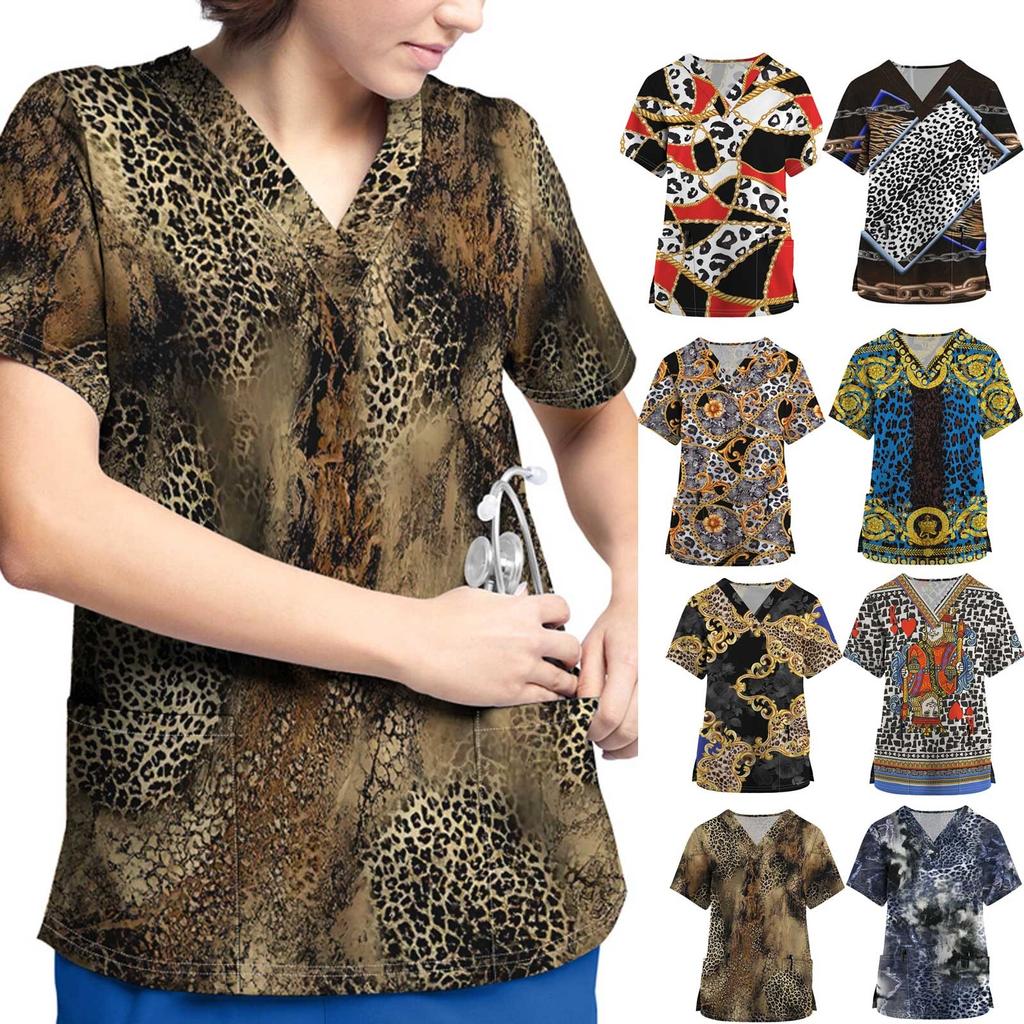Женские топы с короткими рукавами и V-образным вырезом с мультяшным узором, футболка с рабочей униформой