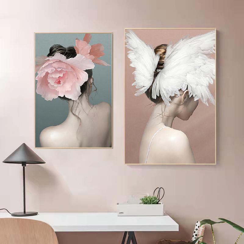 Скандинавские современные девушки, цветок, крылья ангела, головной убор, абстрактные картины для девочек, холст, живопись, настенная живопись, принт, постер, украшение для спальни