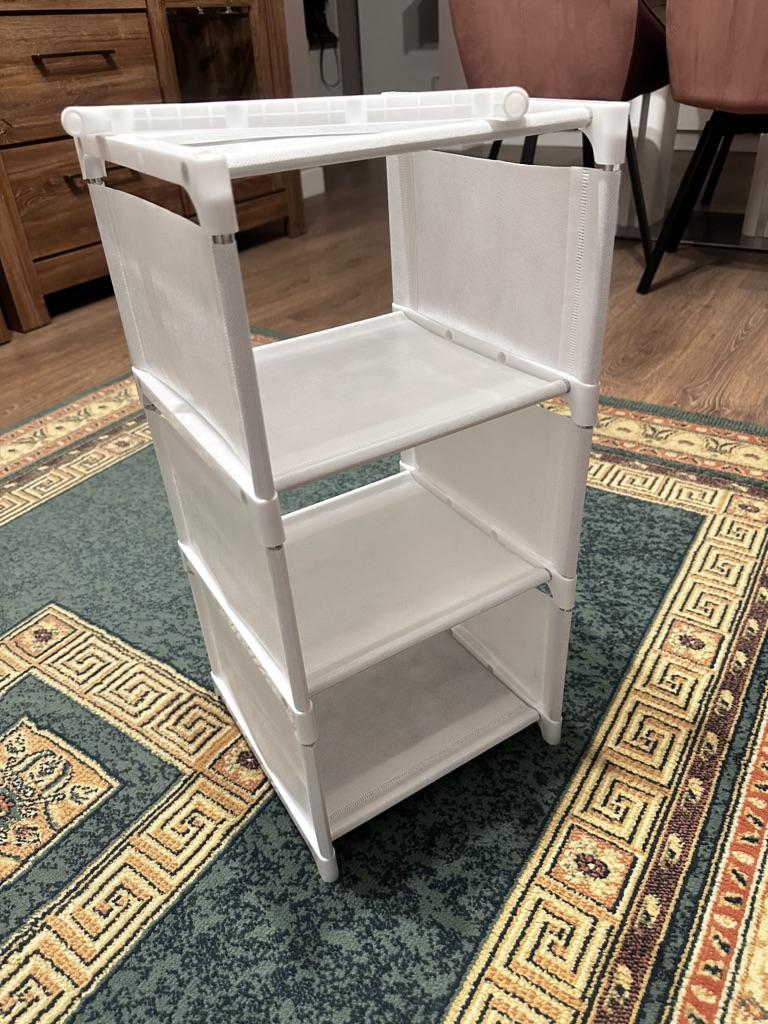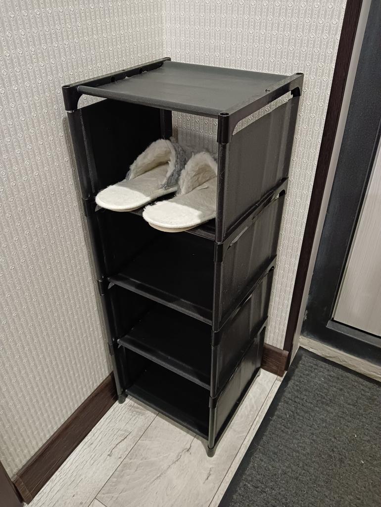 Плюсы: экономит пространство, недорого. Минусы: долго доставляли - полтора месяца; смотрится дёшево, тапки размера 37 не помещаются полностью, не говоря о более крупной обуви. Смотрите размер сразу, до покупки. Другое: очень лёгкая полка - стенки и полки из синтетической ткани, собирается быстро и легко. Несмотря на то, что не всё понравилось, буду использовать. Пока в коридоре поставила, потом в кладовку переставлю. Спасибо за идею, за функционал. Прошло несколько месяцев. Стоит в коридоре и в кладовку не собираюсь убирать. Оказалась очень полезной!
