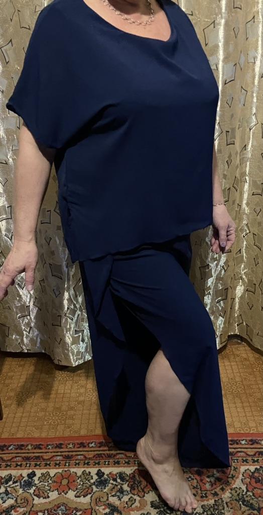 Здравствуйте! Вещь соответствует фото продавца, параметры также совпадают. Материал приятный, мнется хорошо(😉) вещь летняя. Обратите внимание на брюки. У них нет бокового шва (на запах) и с боку они короче, чем по внутреннему шву. Костюм достойный, но со своей спецификой.