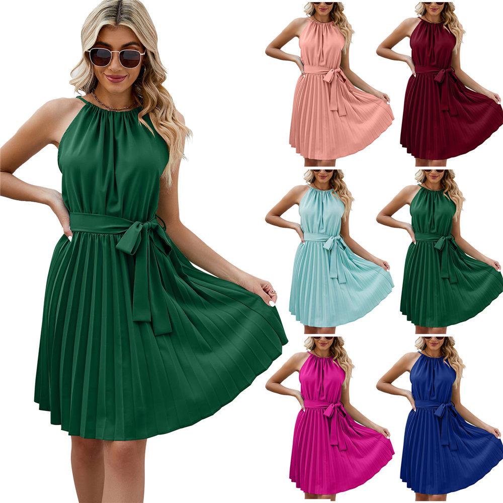 Летние платья для женщин, повседневные, с бретелькой на шее, без рукавов, со складками, на пуговицах сзади и с поясом