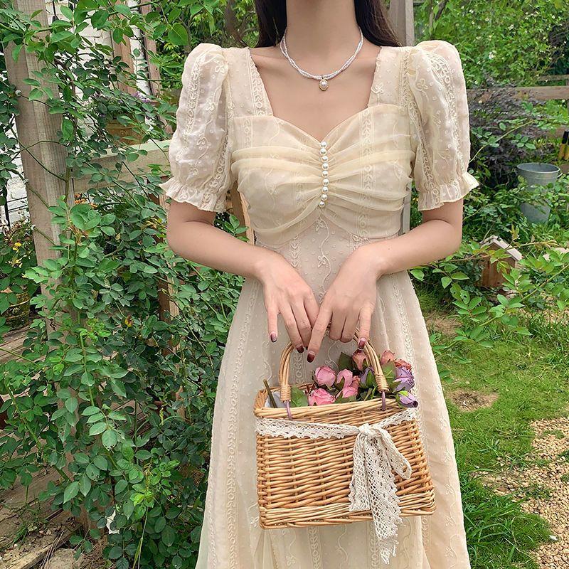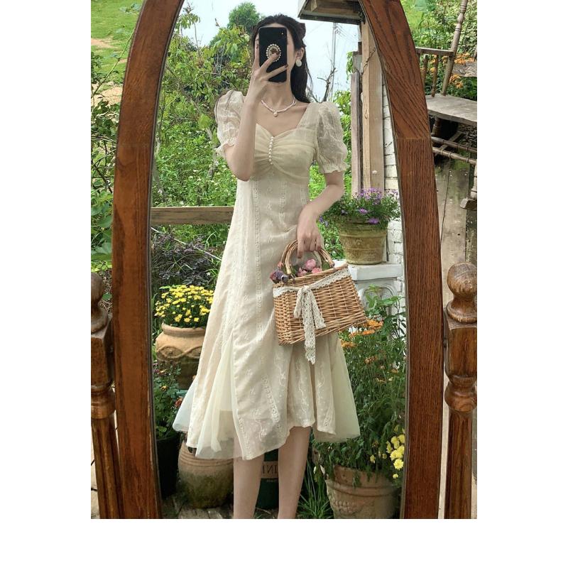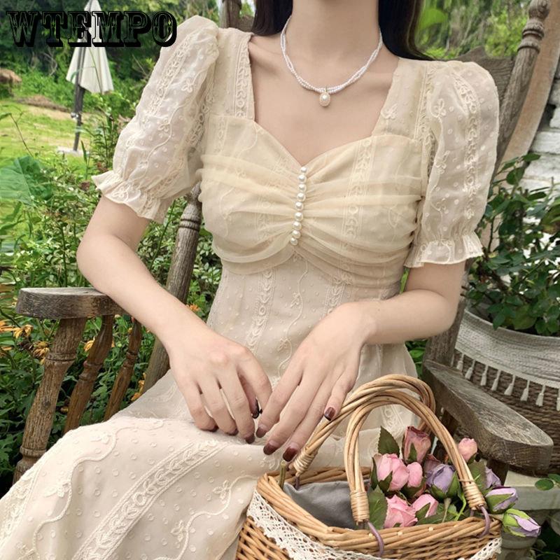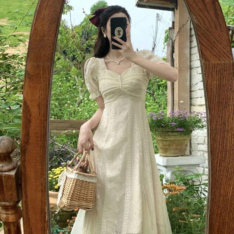 Французские платья, летнее кружевное ретро-нежное и элегантное платье принцессы с квадратным вырезом и рукавами-пузырьками, сплошное цветное платье
