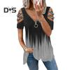 Женская летняя футболка с открытыми плечами, декор со стразами, короткие рукава, большие размеры, свободный подол, V-образный вырез, градиентный контрастный цвет, женская блузка