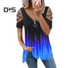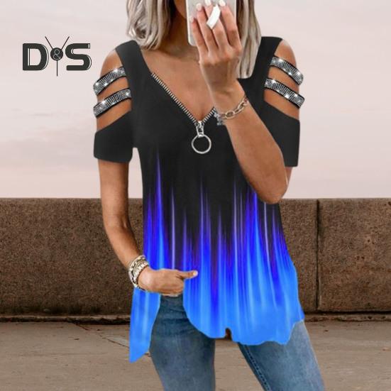 Женская летняя футболка с открытыми плечами, декор со стразами, короткие рукава, большие размеры, свободный подол, V-образный вырез, градиентный контрастный цвет, женская блузка — купить товар онлайн с бесплатной доставкой по всему миру!