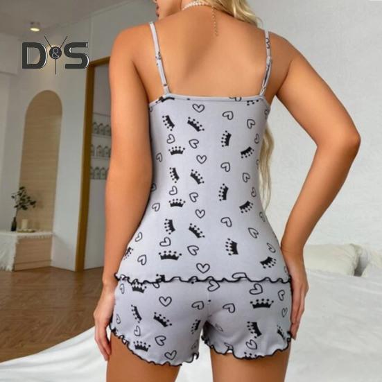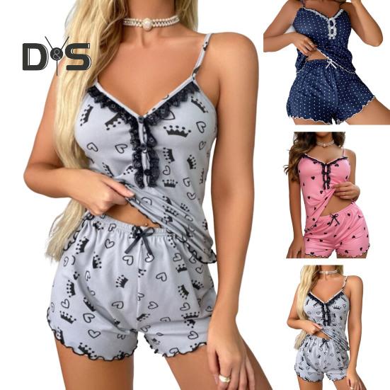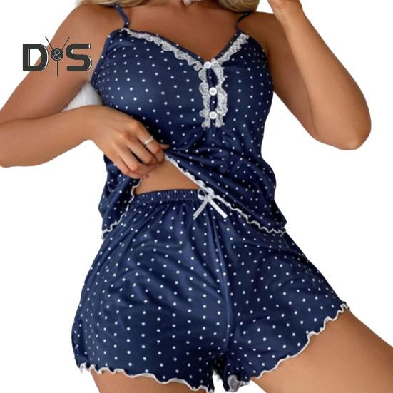Удобный комплект пижамы для девочек делает вас более сексуальной и очаровательной, потому что он имеет одинарный V-образный вырез, кружевную строчку, безспинку, точечный принт и прозрачный дизайн отделки.