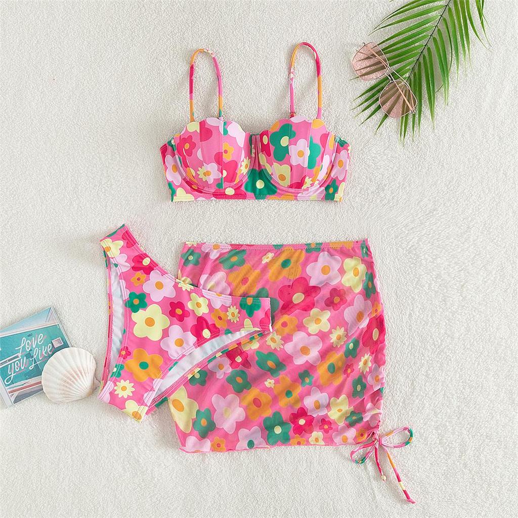 Бикини с цветами, купальник пуш-ап, женский купальник, женский комплект бикини из трех частей с юбкой, бюстгальтер с чашкой, купальный костюм, купальный костюм