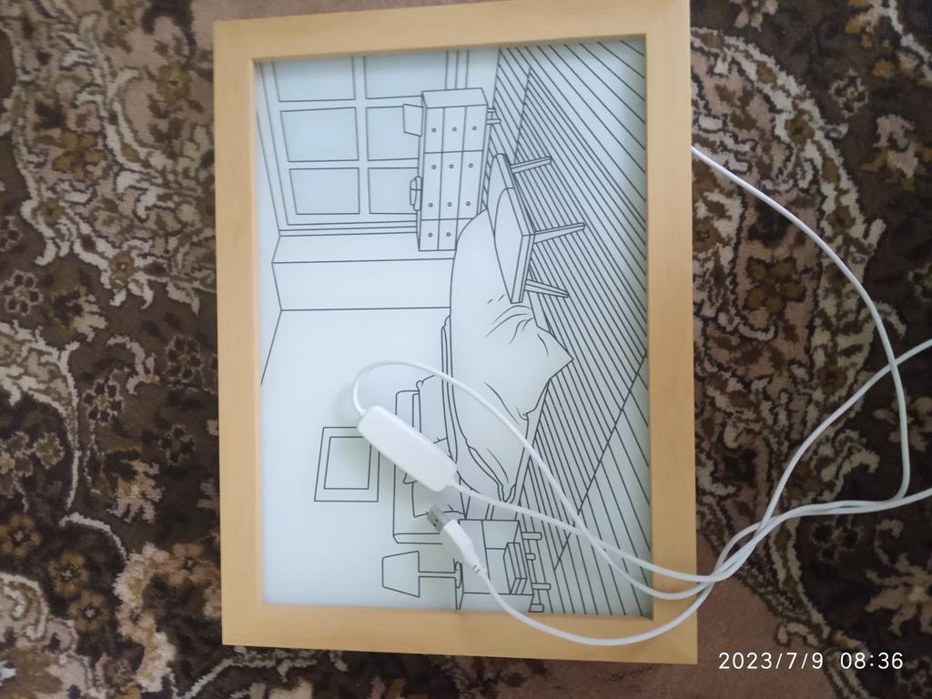 Возможно в моём случае, не аккуратно сделанная картина, в углу и в центре есть побитости и пошарпанности, а также рисунок картины смещён относительно теней, которые появляются при включении, но тут можно сослаться на то, что такой небрежной и должна выглядеть картина по задумке создателя. Издалека выглядит хорошо, и кабель длинный, что радует.