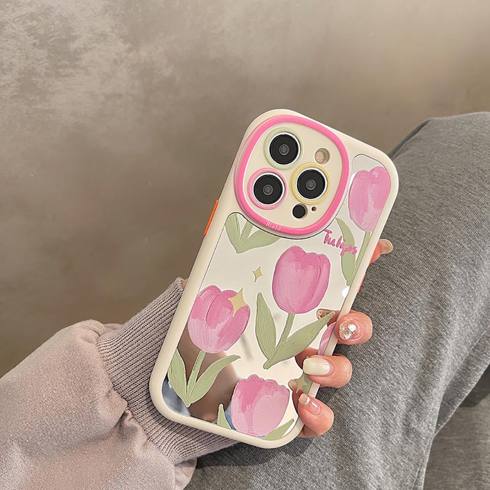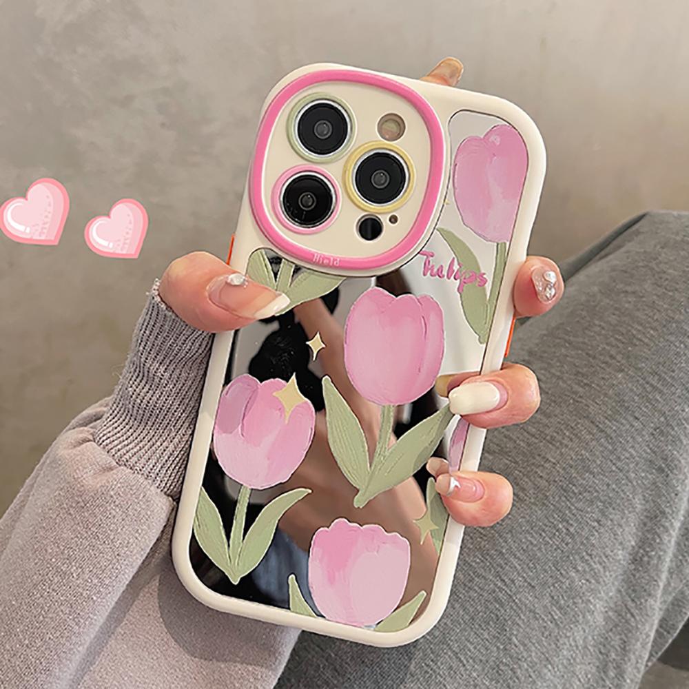 Модный чехол для телефона с розовыми тюльпанами и зеркалом для макияжа с милыми цветами для Iphone 14 11 12 13 Pro Max, противоударная мягкая задняя крышка