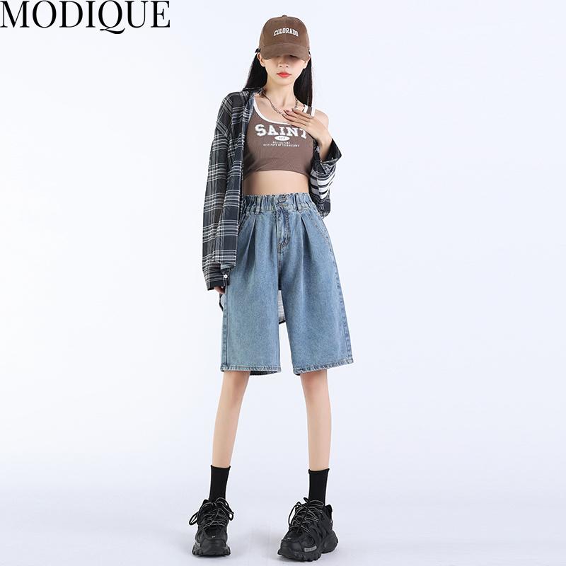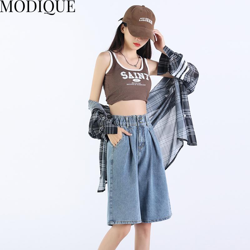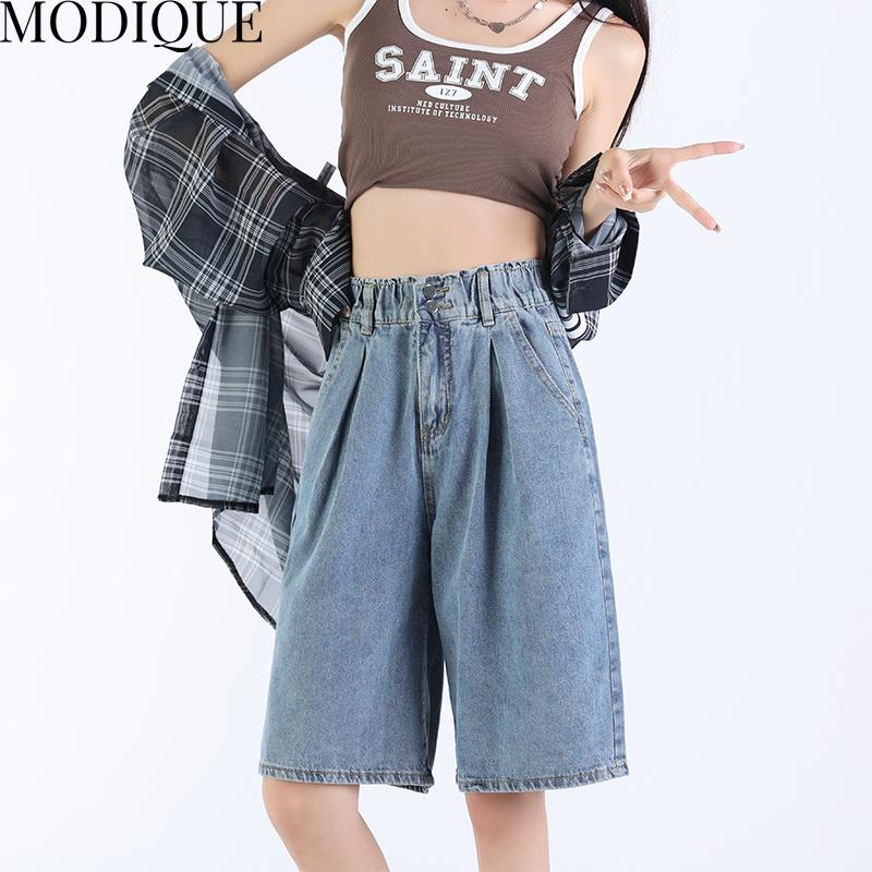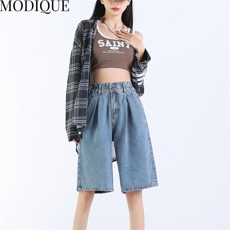 MODIQUE летние джинсы больших размеров, короткие эластичные брюки, женские свободные прямые повседневные однотонные женские базовые брюки с высокой талией и кисточками