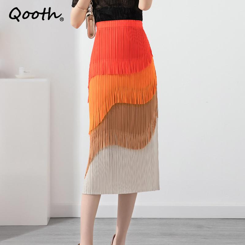 Qooth Женская модная юбка-карандаш с кисточками и разрезом на бедрах, элегантная плиссированная юбка-карандаш средней длины с высокой талией на весну и лето QT2120