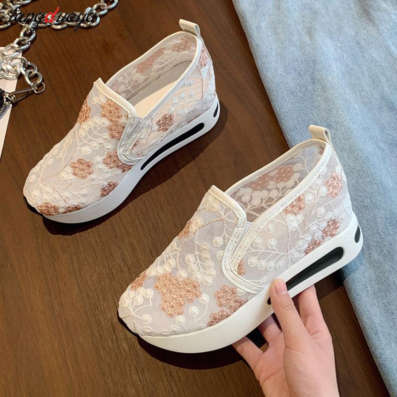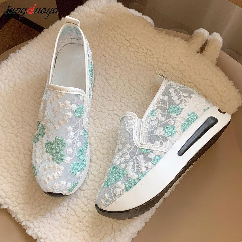 Женские кроссовки на танкетке с цветочной вышивкой, женские сетчатые кроссовки без шнуровки, повседневная удобная женская обувь на каблуке