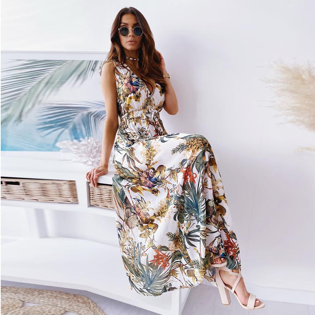 Женские повседневные летние платья Платье макси с бретелькой на шее Женская праздничная одежда с v-образным вырезом Длинное платье Пляжная одежда с принтом Платья без рукавов Платье