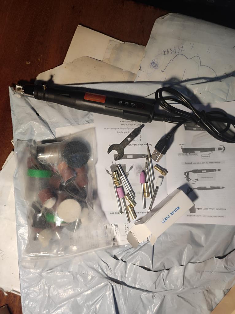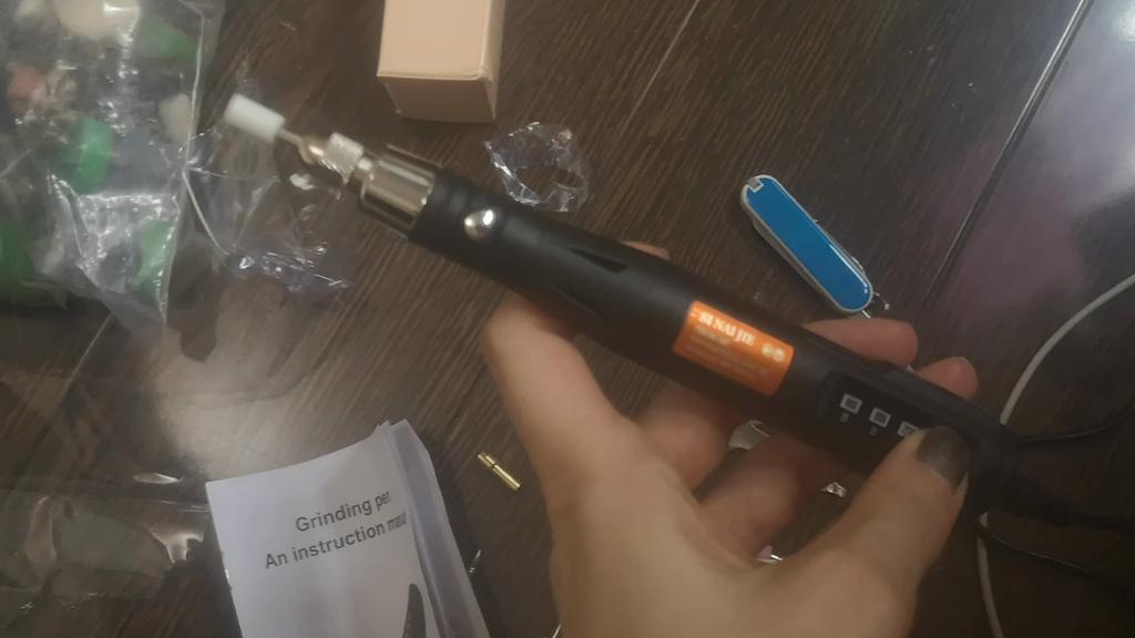 Ручная мини-электрическая шлифовальная машина ❤️ Инструмент можно использовать как мини-дрель, для гравировки, полировки и для других целей. Прибор компактный, удобный в использовании. Основной набор состоит из самой шлифовальной машины, кабеля питания USB, инструкции и 16 приспособлений для шлифовки, гравировки. Всё было аккуратно упаковано в специальную коробку, запаянную пленкой.Кроме этого, у продавца можно заказать набор дополнительных аксессуаров из 105 или 161 предмета, что я и сделала. Прибор работает от кабеля, разъем USB. Длинна кабеля 1 м. Учитывая какие задачи выполняются с помощью этой машинки, неудобства это не доставляет. Наоборот, отсутствие встроенного аккумулятора сделало прибор компактнее и легче.Управление осуществляется с помощью одной кнопки, которая переключает режимы вращения от 5000 до 15000 оборотов в минуту. Всего доступно три режима вращения: - 5000 об/мин; - 10000 об/мин; - 15000 об/мин. Режимы вращения отображаются с помощью световых индикаторов на корпусе. Заявленная мощность прибора 30 Вт, входное напряжение 5 В, 2 А. Диаметр корпуса - 23 мм, длинна без насадок - 16.5 см. В основном наборе 6 цанг для зажима аксессуаров диаметром от 0,5 до 3,2 мм. Также в наборе есть ключ для более надёжной фиксации аксессуаров в устройстве.Работает прибор ровно, уровень шума умеренный. В целом, муж остался полностью доволен покупкой. Товар рекомендую 👍 Удачных покупок ❤️ Ваша Вика 🙂
